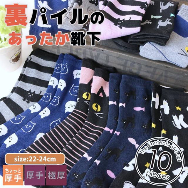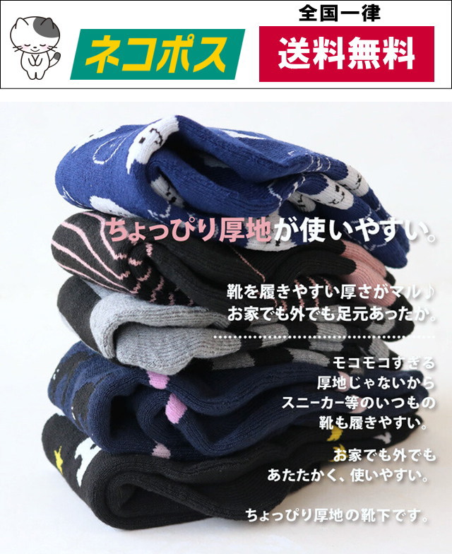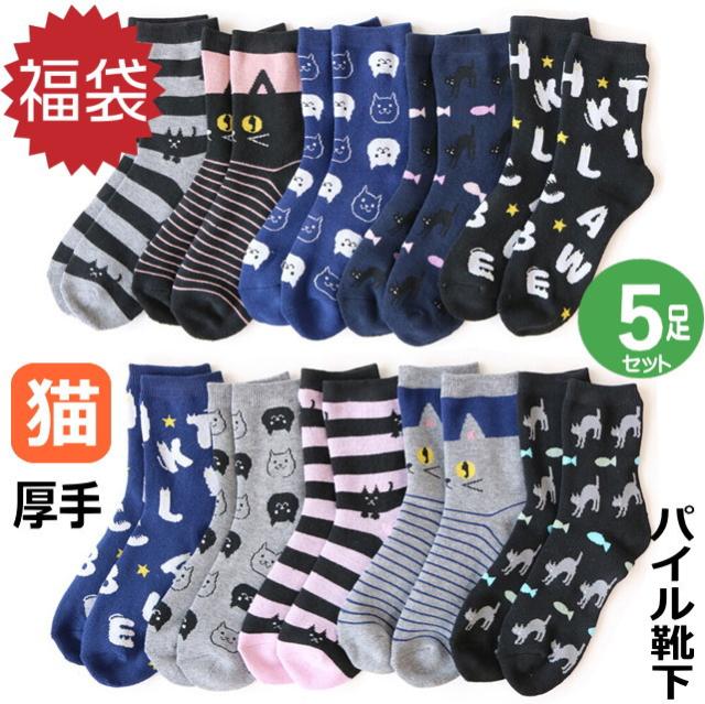 【送料無料】 靴下 福袋 1000円 ポッキリ 送料無料 クルー ソックス 婦人 レディース 5足セット パイル あったか ちょっと厚手 猫柄 かわいい おしゃれ 景品 ギフト プレゼント