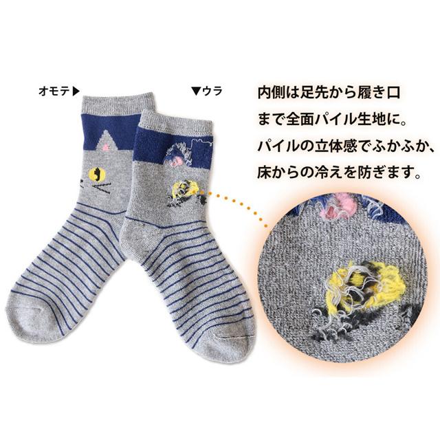 クルー丈 カジュアルで可愛い 裏パイルの 猫柄のソックスです。