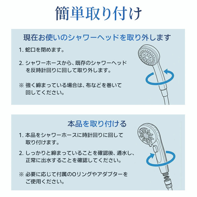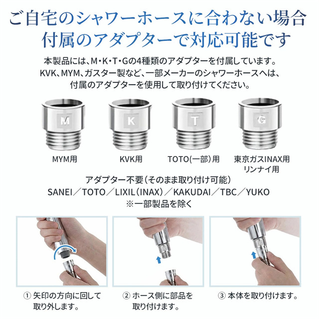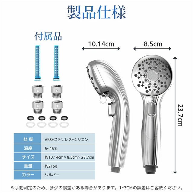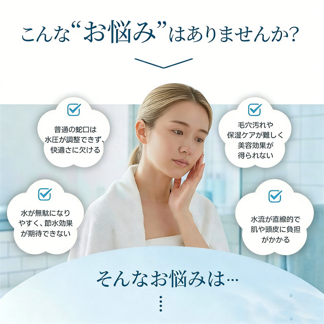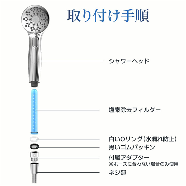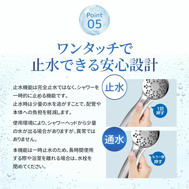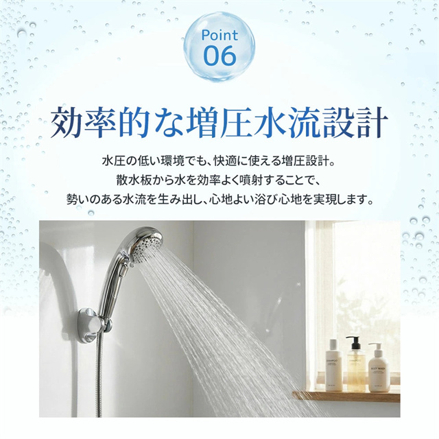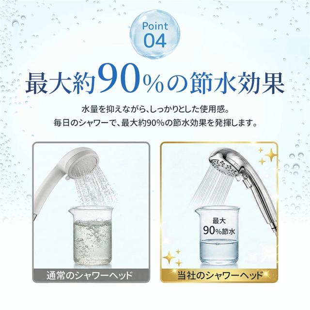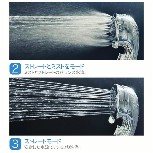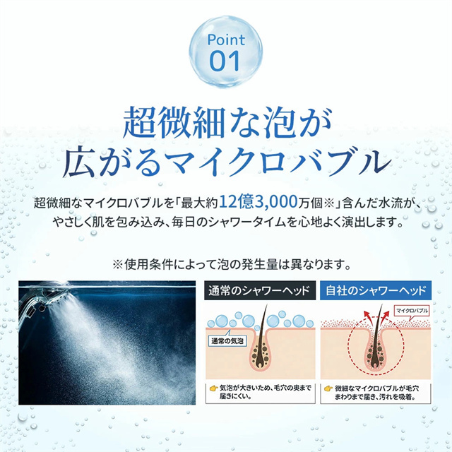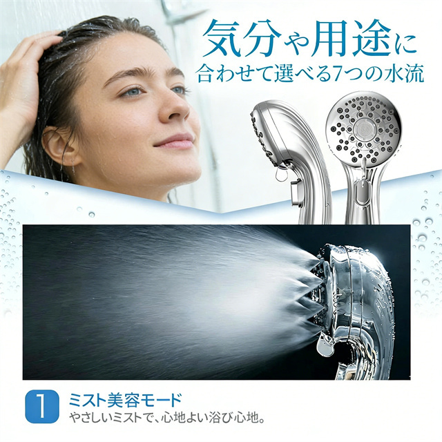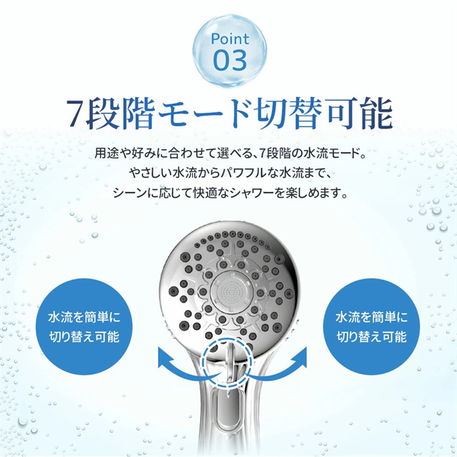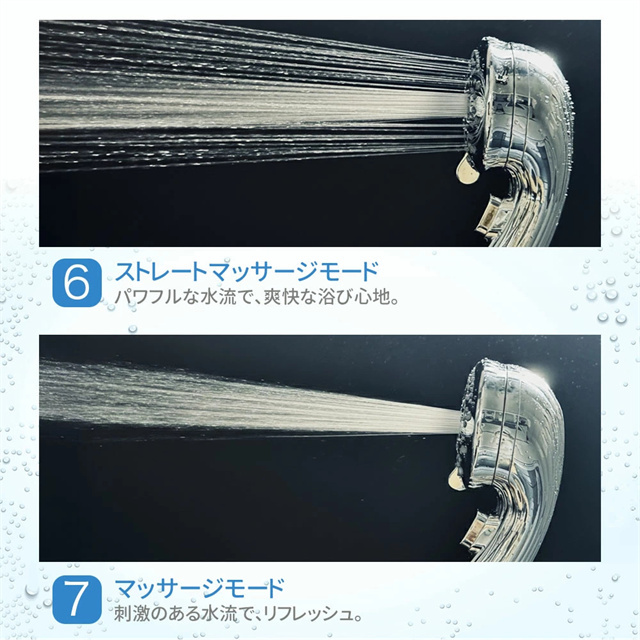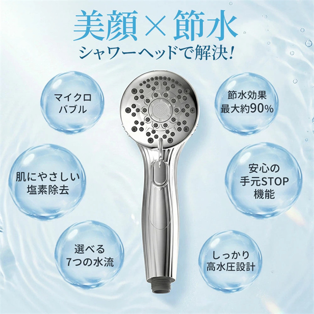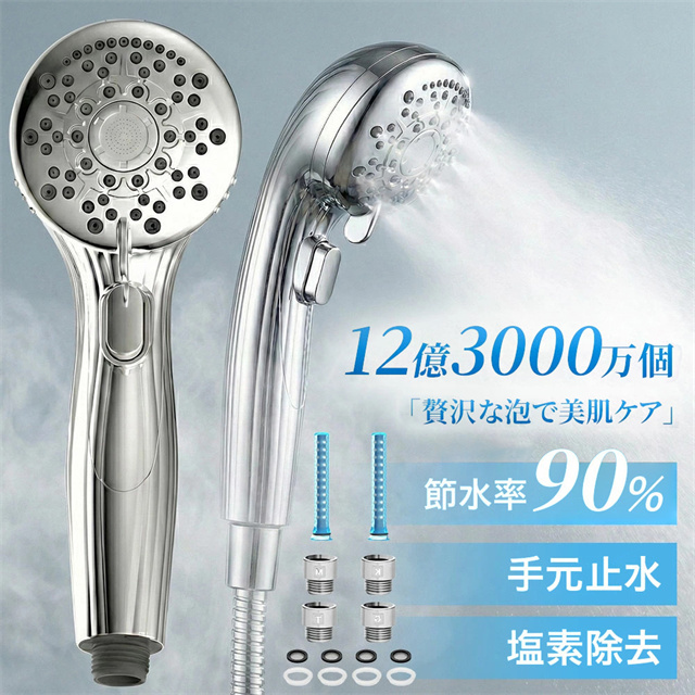 | 特徴 | 【1】超微細マイクロバブルで毛穴汚れまでスッキリ洗浄 最大約12億3,000万個の超微細マイクロバブルが、毛穴の奥まで入り込み、皮脂汚れや古い角質をやさしく洗い流します。洗うたびに肌がうるおい、敏感肌の方やお子様にもおすすめのシャワーヘッドです。 【2】残留塩素を約80%除去、肌・髪にやさしい水へ 内蔵の塩素除去フィルターが水道水中の残留塩素を低減。肌への刺激を抑え、乾燥やゴワつきが気になる方、頭皮ケアやヘアケアを重視したい方にも最適です。家族みんなで安心して使えます。 【3】7段階水流モードで好みに合わせて快適シャワー ミスト・ストレート・ジェット・マッサージなど、用途や気分に合わせて選べる7段階水流。やさしく包み込むミストから、しっかり洗い流すパワフル水流まで、毎日のバスタイムがワンランク上の心地よさに。 【4】最大約90%の節水効果で水道代・ガス代を節約 水量を抑えながらもしっかりとした水圧を実現する増圧設計。節水しながら満足感のある浴び心地で、毎日のシャワーで無理なくエコ&節約が可能です。 【5】手元止水ボタン&簡単取り付けで使いやすさ抜群 ワンタッチで止水・通水ができる手元ストップ機能付き。シャンプー中のムダ水を防ぎます。工具不要で取り付け簡単、各メーカー対応アダプター付属で、ご自宅のシャワーホースに幅広く対応します。 毎日のシャワーを「美容ケア×節水×快適操作」に。 自宅用はもちろん、家族全員で使えるシャワーヘッドとしておすすめです。 |