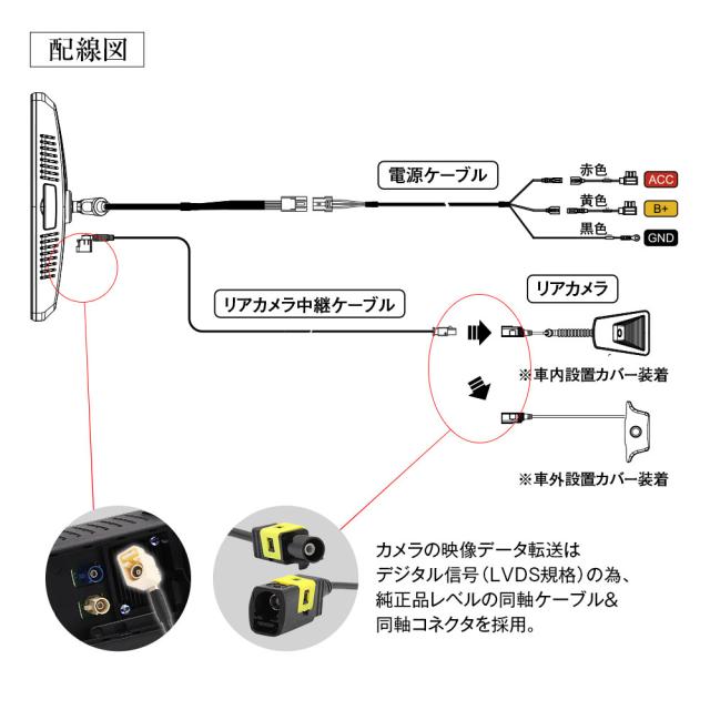 カメラの映像データ転送はデジタル信号(LVDS規格)の為、純正品レベルの同軸ケーブル&同軸コネクタを採用。 - 電波干渉対策済※当社基準