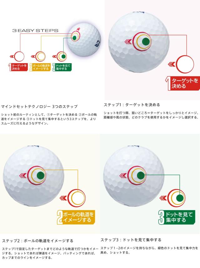 ジェイソン・デイのメンタルコーチとともに、ショット時の集中力を高める 3ステップのルーティン(ターゲットを決める・ボールの軌道をイメージする・ドットを見て集中する)をサポートし、イメージ通りのショットに導く「マインドセット」マークを開発。なかなか常にルーティンを意識するのは難しいので、マインドセットマークのサポートを受け、ショット前の3ステップを身に着けて「メガ飛ット!」を実現しましょう!