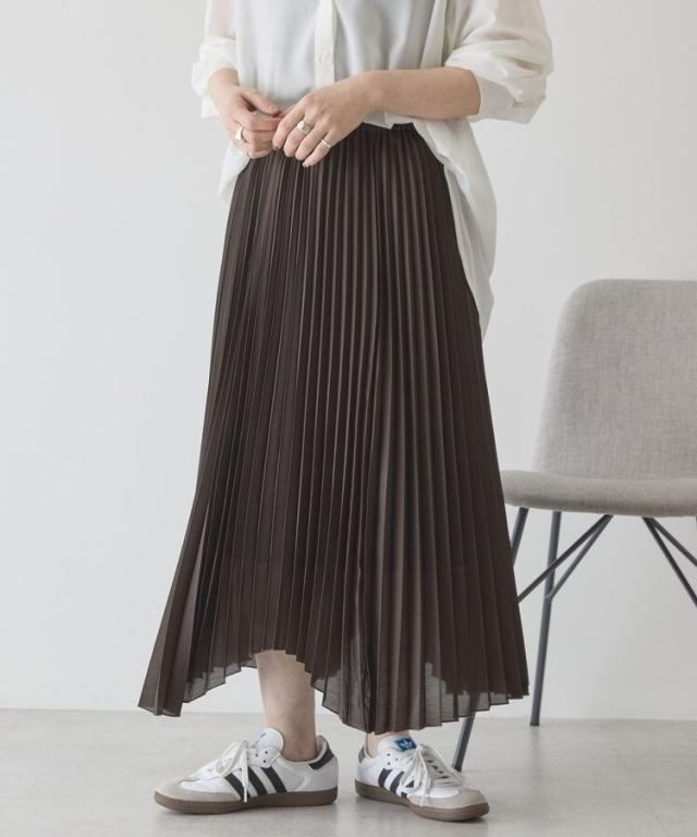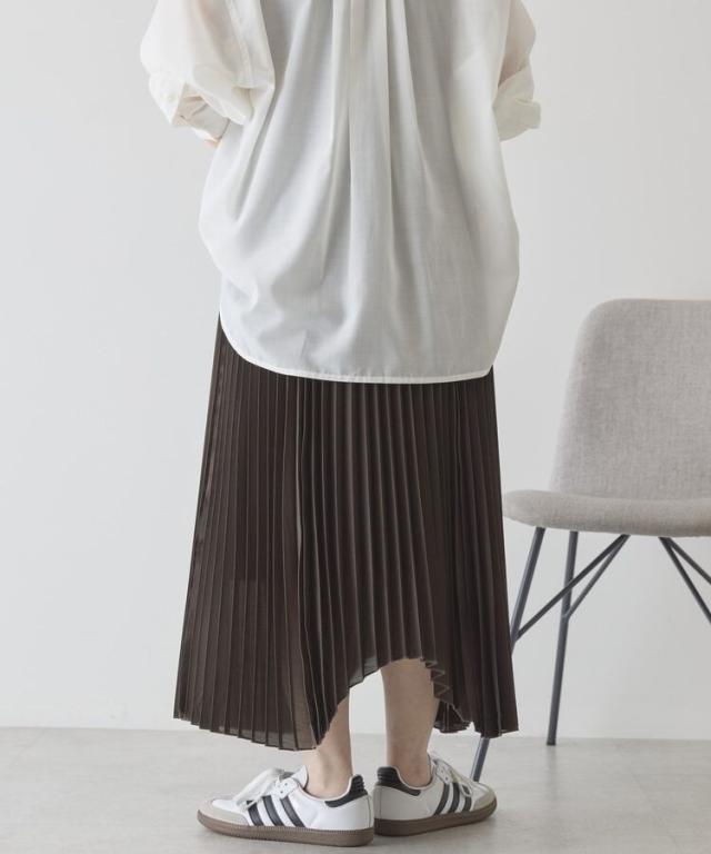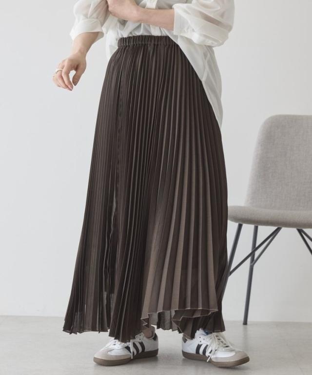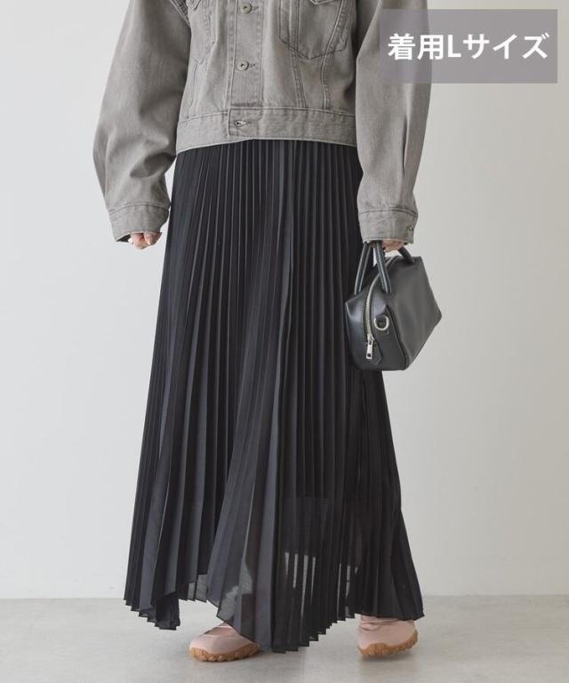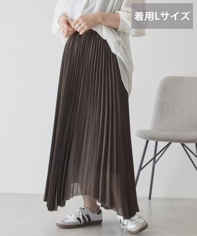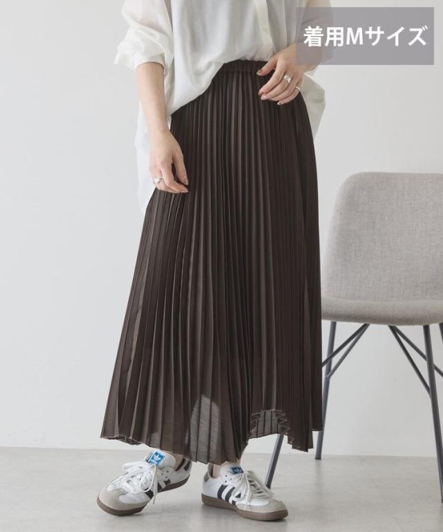 選べる丈で、自分らしい軽やかさを楽しめますやわらかなシアー素材に細かなプリーツを施し、空気を含んだような軽快な表情に仕上げています。歩くたびに自然なドレープが生まれ、体のラインを拾いにくいため安心感のある着用感です。ウエストはゴム仕様で着脱がしやすく、リラックスしたはき心地が続きます。丈を選べるため、足元のバランスやコーディネートの雰囲気に合わせて最適な一着を選べます。アシメヘムのデザインが単調になりがちなスタイルに動きをプラスし、シンプルなトップスとも好相性です。カジュアルな装いに取り入れるだけで、程よく大人の雰囲気を演出できます。日常使いからお出かけまで活躍し、着回し力と上品さを兼ね備えた便利なアイテムです。