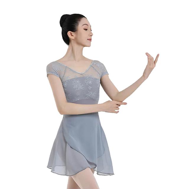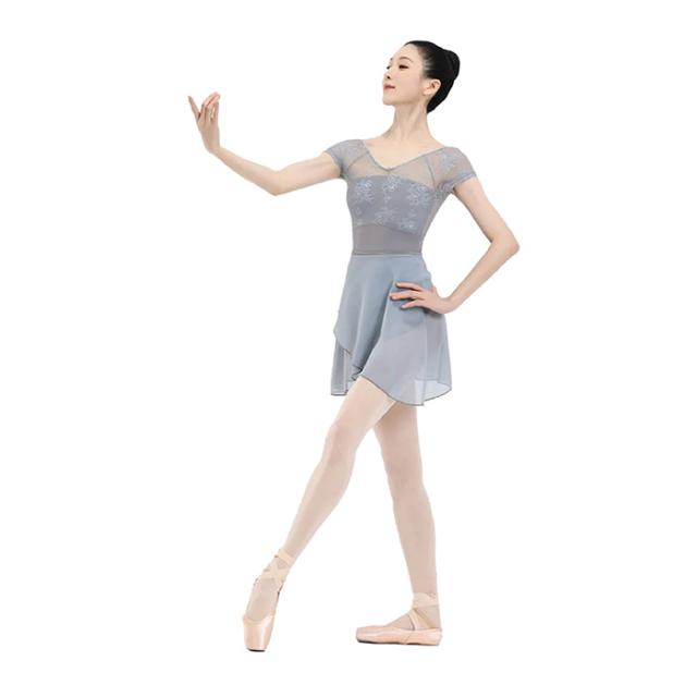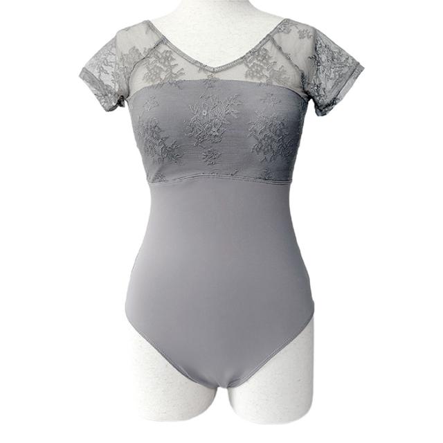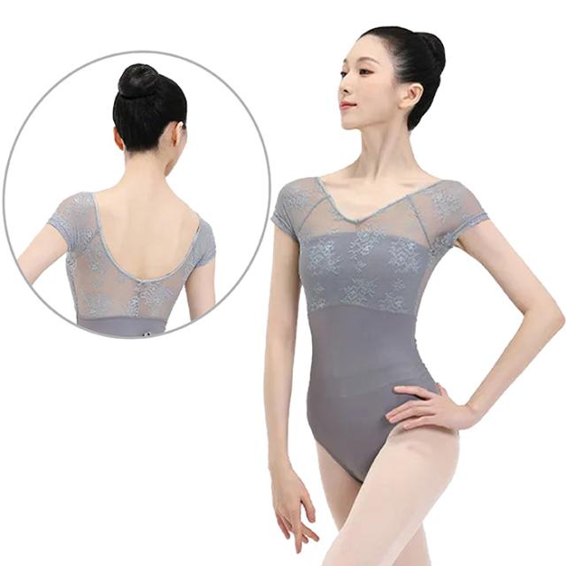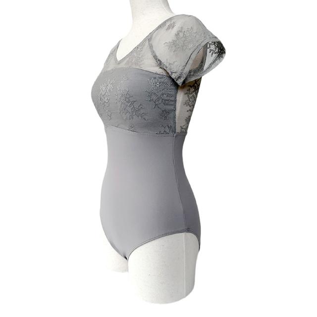 花柄レース メッシュ バレエレオタード 半袖 ジュニア 大人用 バストポケット付き バストパット付き 花がら ストレッチ 伸縮 レッスン 練習 着 グレー 灰色 デコルテ 綺麗見せ Vネック ハイウエスト 切り替え 透け感 上品 おとな 可愛い 155 160 165 170