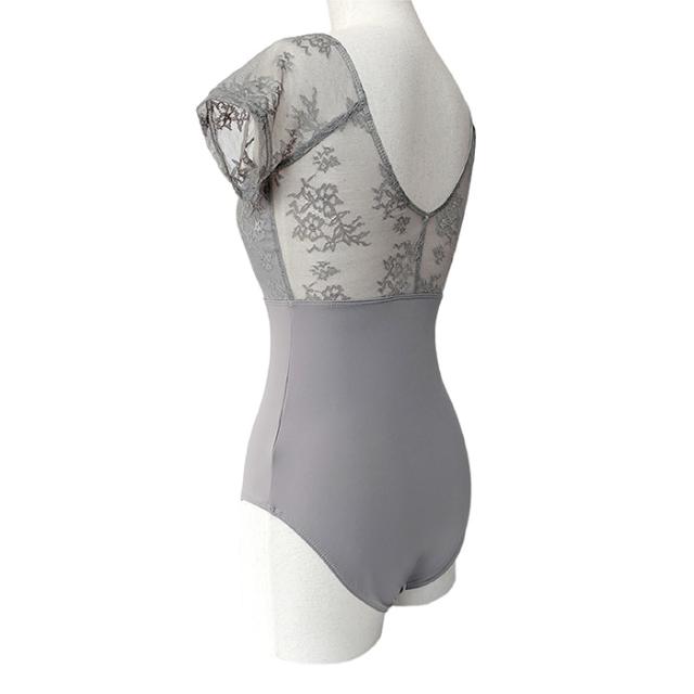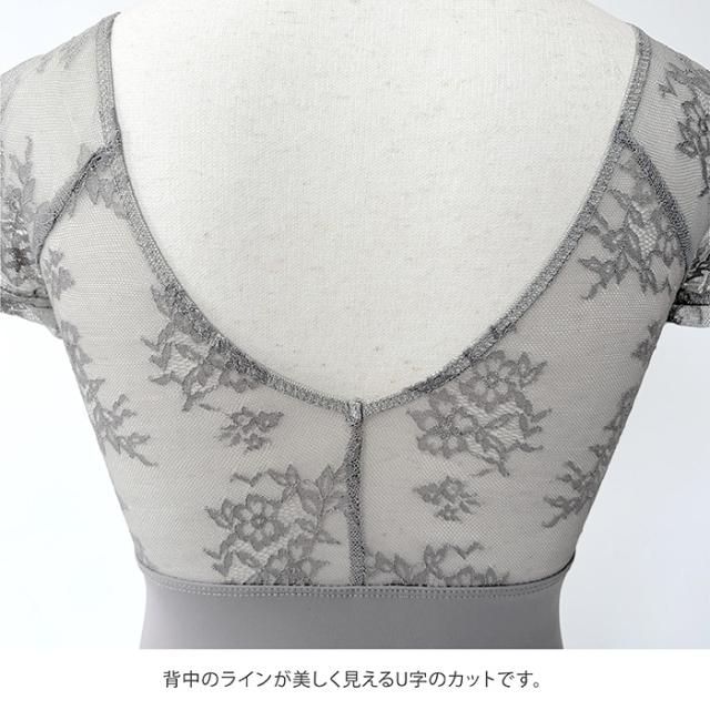 花柄のメッシュレースが美しく、上品な透け感の半袖レオタード。首元も背中も開きは控えめですが、レースが肌をキレイに見せてくれます♪脚長効果もあるデザイン◎