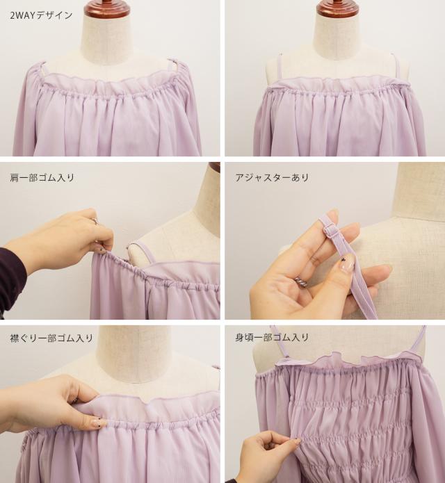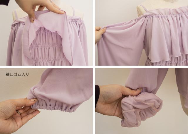 | 落ち感のあるさらりとした生地で上品な透け感のあるシフォン楊柳素材。 ※袖部分のみ内側がチュールで吊られています。 |