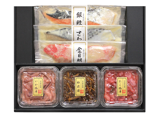 商品名 【母の日】祇園又吉 西京漬&海鮮漬 KF-FCR 容量 さわら・金目鯛・銀鮭各60g×各1切れ、松前漬・たこ塩辛・いか塩辛各50g×各1個 原材料名 【さわら】さわら(韓国産)、米味噌、発酵調味料、食塩、(一部に大豆を含む)