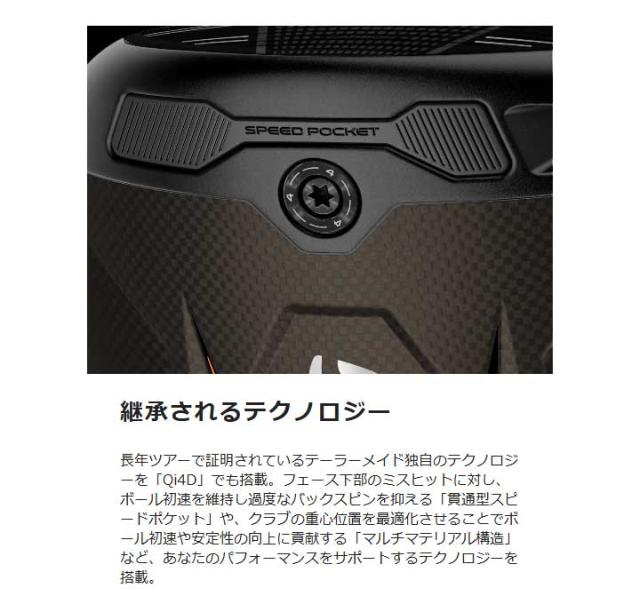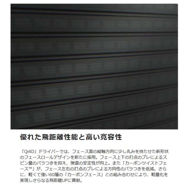 スピードの新定義。テーラーメイドのDNAである「飛び」に向き合い、さらなるスピードを追い求め誕生した「Qi4D」ドライバー。進化した5代目となる「カーボンフェース」により、飛距離性能が向上し、スピン量も最適化。さらに、進化したヘッド形状が空気抵抗を抑え、さらなるへッドスピードUPに貢献。あらゆるゴルファーの「飛び」をサポートする4つのモデルに加え、新「REAX」シャフトの組み合わせで、あなたの「飛び」の可能性は無限に広がる。