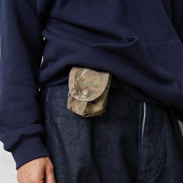 米軍から放出されたMOLLEシステム対応のグレネードポーチです。迷彩には、2000年代以降に米軍が本格採用したMULTICAMパターンを使用。多様な地形や環境に対応するために開発されたこの迷彩は、高い汎用性を誇り、実用性の高さから現在では米軍装備を代表するパターンのひとつとして知られています。耐久性に優れたナイロン素材を使用し、日常使いからアウトドア、タウンユースまで幅広く対応。フラップはスナップボタン仕様で、中身をしっかりと保護しながらスムーズな開閉が可能です。背面はMOLLE対応となっており、ベストやバッグ、ベルトなどさまざまなアイテムに取り付けができます。