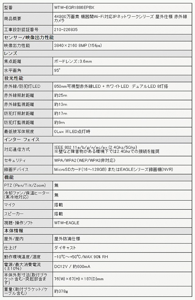■ WTW-EGR1886EPBX | 4K800万画素機器間Wi-Fi対応IPネットワーク防犯灯カメラ