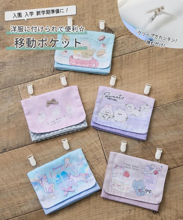 クリップでしっかり留まって毎日のお洋服に留めるだけ ポケットがないお子様のボトムに付けられる便利な移動ポケットです! ■デザイン ・内側は2段ポケットになっているのでハンカチやマスクなどを分けて収納できます ・開閉はお子様にも扱いやすい面ファスナー ・ポケット内側にお名前タグ付き ・男の子にも女の子にもおすすめの柄をご用意しました ■素材 しわになりにくいポリエステル織物素材