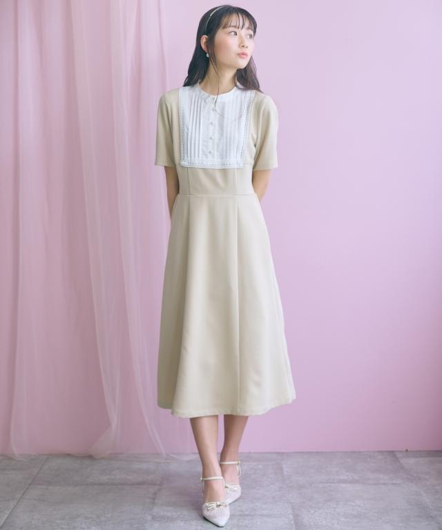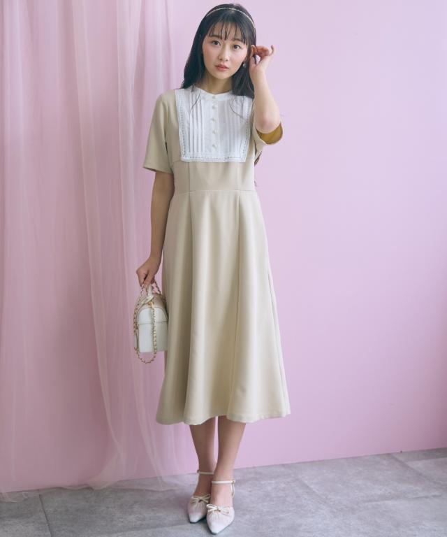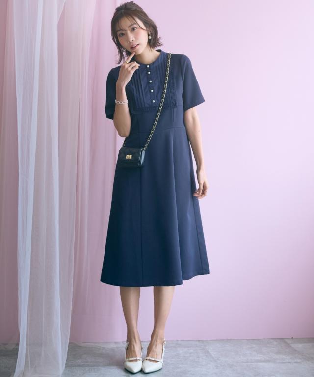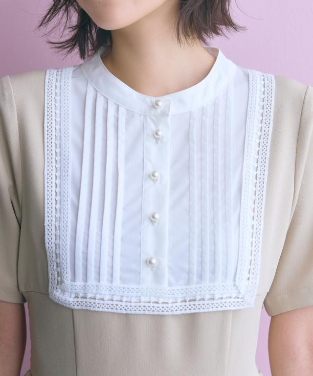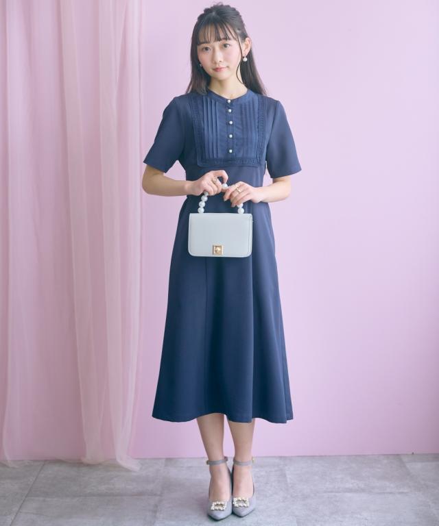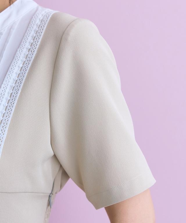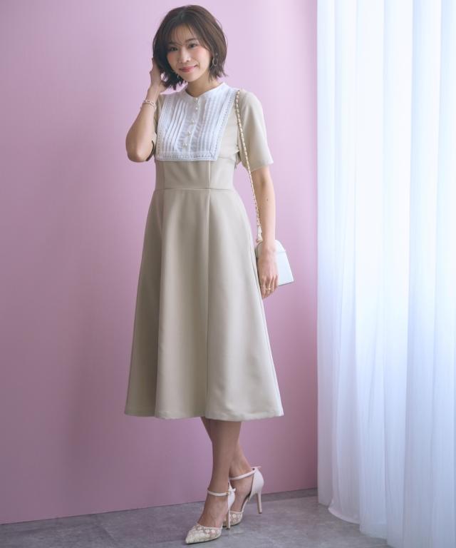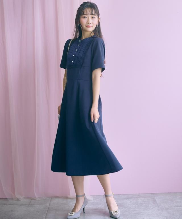 胸元のレース使いが顔周りを華やかに見せてくれる清楚でクラシカルな雰囲気のワンピースです。 ■デザイン 胸元のシャツ切替部にさりげないレース使いが視線を上に集めますウエストが程よくシェイプされ、Aラインシルエットが女性らしさを強調します。 ■素材 シワになりにくく綺麗なフレアシルエットをキープしてくれます。 ■おすすめのスタイリング 膝下までのミディ丈は、お呼ばれやデート、オフィスなど幅広いシーンで好印象を与えます。ジャケットを羽織ることで、ワンピースのクラシカルな雰囲気がさらに引き立ちクラス感がアップ。よりフォーマルなシーンやオフィススタイルとしても素敵です。