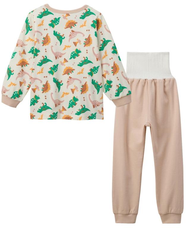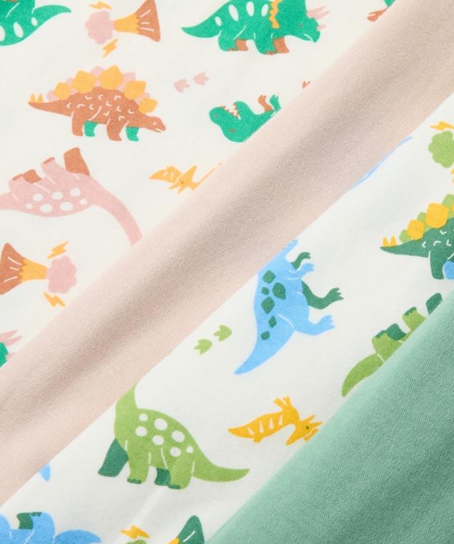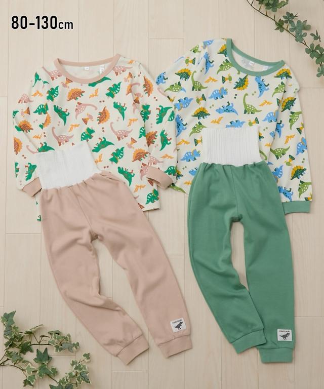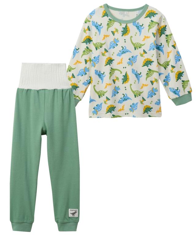 あたたかくなってきても朝晩はまだまだ冷える☆ そんな時には腹巻付きが安心 人気の恐竜を総柄にしたかわいいパジャマです ■デザイン ・恐竜総柄がかわいい ・衿・袖口やパンツの配色がポイント ・パンツ裾の恐竜柄チケットがアクセント ■素材 ・春や秋におすすめのカットソースムース素材