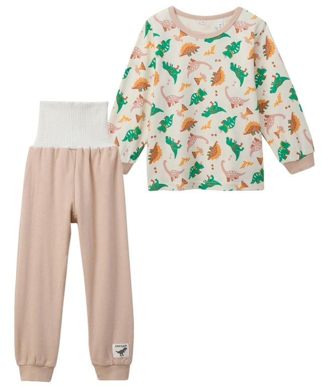 あたたかくなってきても朝晩はまだまだ冷える☆ そんな時には腹巻付きが安心 人気の恐竜を総柄にしたかわいいパジャマです ■デザイン ・恐竜総柄がかわいい ・衿・袖口やパンツの配色がポイント ・パンツ裾の恐竜柄チケットがアクセント ■素材 ・春や秋におすすめのカットソースムース素材