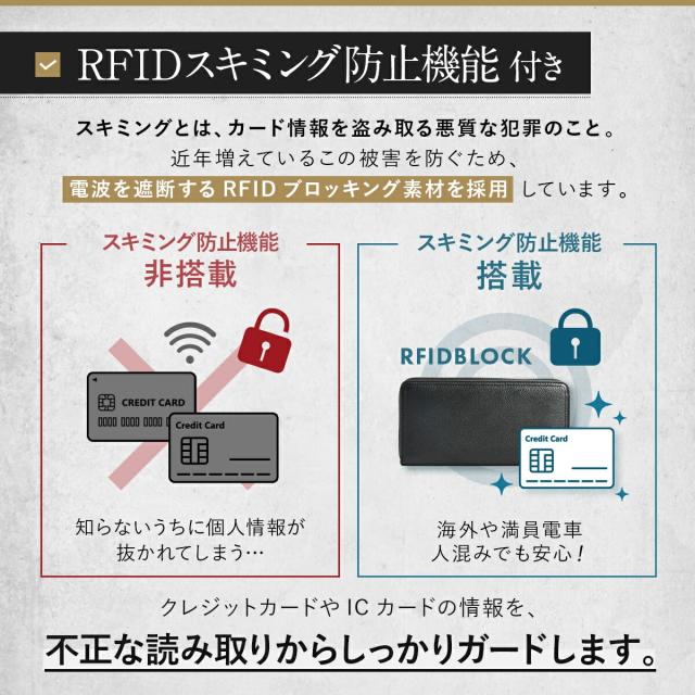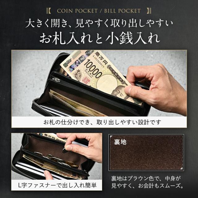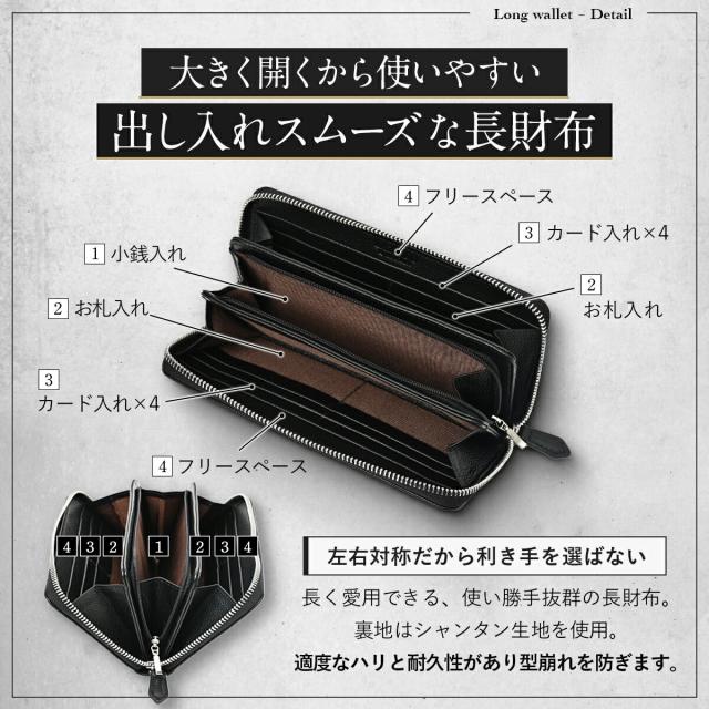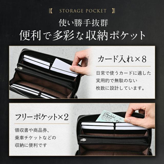 【1. 上質な素材と確かな品質】 本革の中でも高級ランクに位置付けられるトップグレインレザーを贅沢に使用。 有名ブランドも採用するこの革は、表面には繊細で均一なシボが浮かび、自然な革の風合いを美しく表現します。 さらに、日本皮革研究所の検査によって「銀面革」であることが確認されており、革のクオリティと信頼性が裏付けられています。 傷や汚れが目立ちにくく、経年変化も穏やかなので、新品のような美しさを長くキープできます。 【2. 使いやすさを追求した収納設計】 日常使いに最適化された実用的な収納スペースが魅力。 カードポケットは片側4枚×両側の計8枚分を確保し、使う頻度の高いカードをすっきり収納できます。 フリーポケットは両側に1か所ずつ配置し、領収書やチケットなどの一時保管に便利。 お札入れは仕分けしやすい2か所設計、小銭入れはL字ファスナー仕様で出し入れがスムーズ。 中が見やすいブラウン裏地で視認性も良好です。 【3. デザイン性と操作性のバランス】 落ち着きのあるカラー展開と上品な質感で、ビジネスからカジュアルまで幅広く対応。 左右対称の設計により、右利き・左利き問わず快適に使えるユニバーサルデザインです。 内部には、形を保ちやすく扱いやすいシャンタン生地を採用し、機能性と見た目の両立を実現。 どこをとっても“使いやすさ”を感じられる構造です。 【4. 安心感と細部へのこだわり】 ファスナーにはスムーズな開閉で定評のあるYKK製を採用し、毎日の使用もストレスフリー。 均一な縫製と美しいコバ仕上げにより、型崩れしにくく、長期間使っても美しさをキープできます。 さらに、RFIDブロッキング機能を搭載。 不正なカード情報の読み取りを防ぎ、大切なクレジットカードやICカードをしっかり守ります。 【5. サイズ・重量・ギフト対応】 サイズ:横19.5cm × 縦10.0cm × 厚み2.5cm 重量:約220g 素材:牛本革(トップグレインレザー)、裏地:シャンタン生地 高級感のある専用ギフトボックス入りで、贈り物としても最適。 誕生日・記念日・父の日・母の日・クリスマスなど、特別な日のプレゼントにも自信を持っておすすめできる一品です。 |