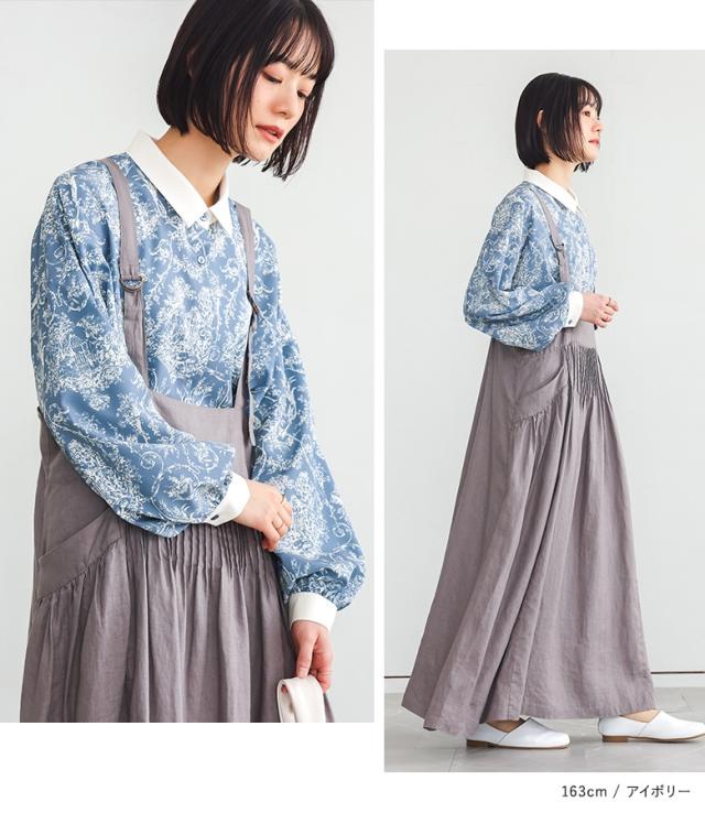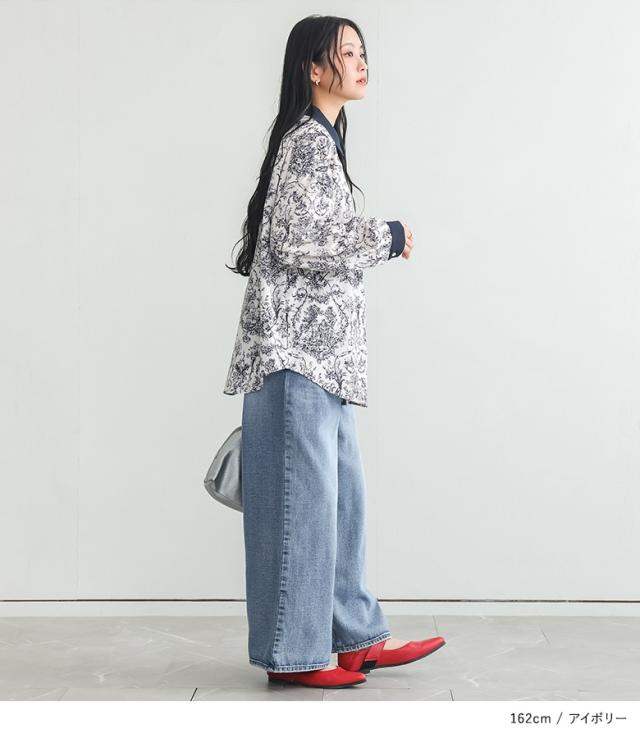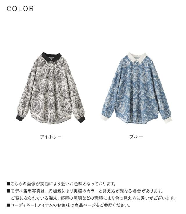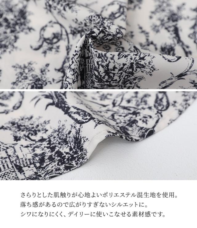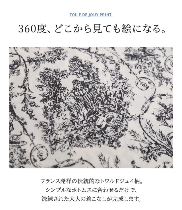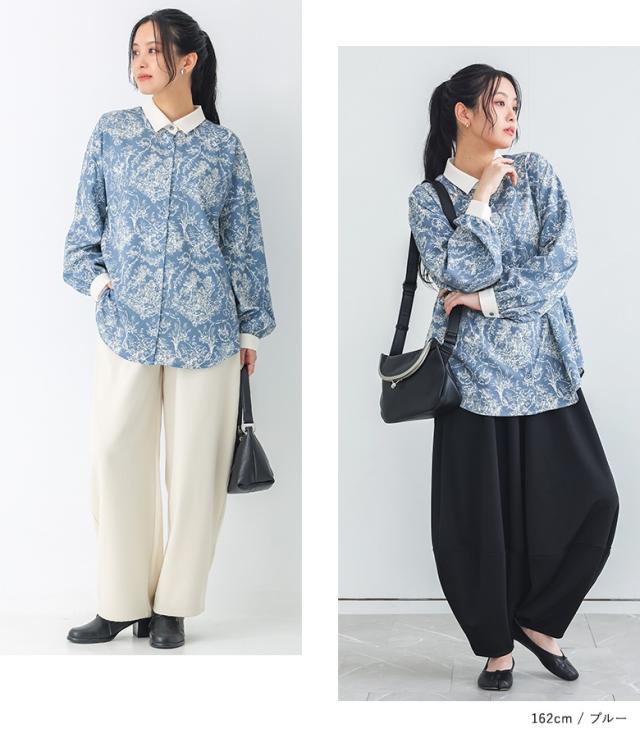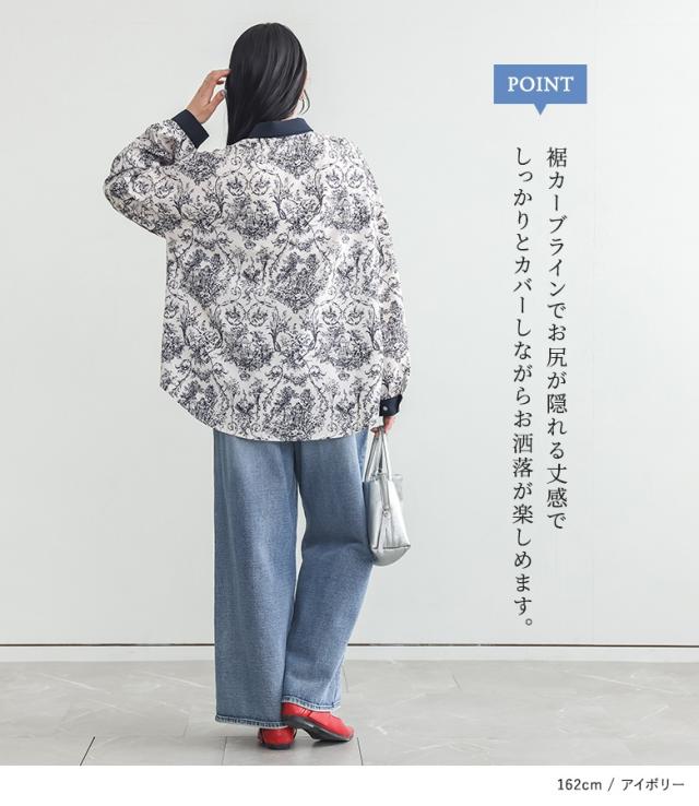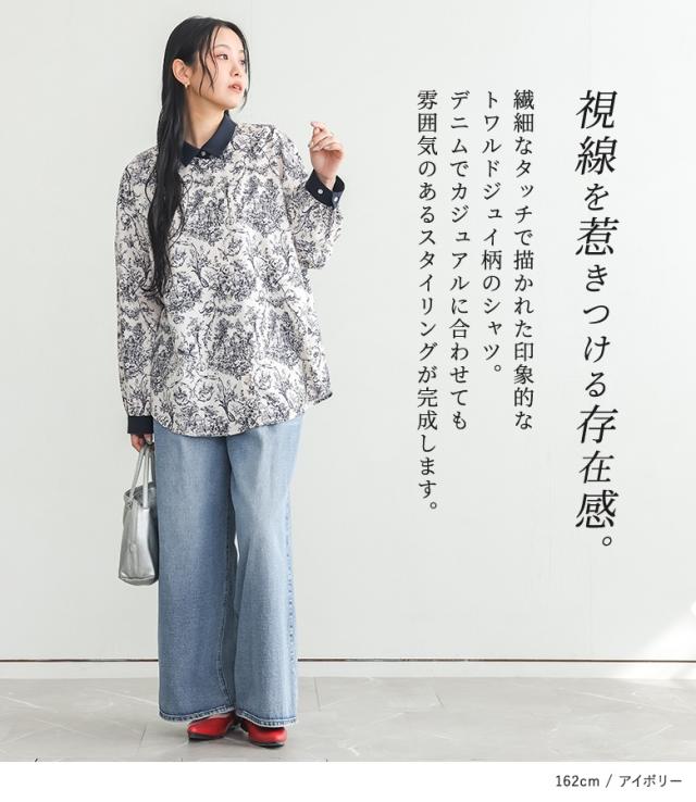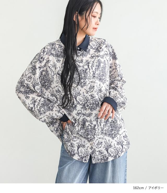 <冬新作>『トワルドジュイ柄シャツ』※メール便可※【10】[シャツ 長袖 レディース トップス ブラウス トワルドジュイ柄 総柄 無地 ギャザー 落ち感 お尻が隠れる レイヤード 重ね着 春 秋]