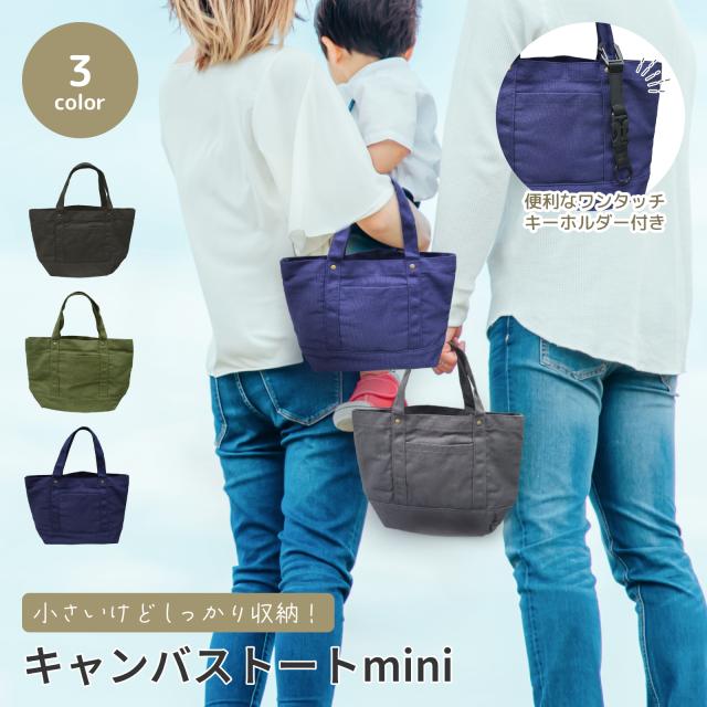 キャンバストートバッグ ミニ 6ポケット収納 ワンタッチキーホルダー付 軽量 無地 帆布素材 4.5L容量 男女兼用 レディース メンズ ブラック/ネイビー/グリーン シンプル ミニサイズ バッグインバッグ 送料無料