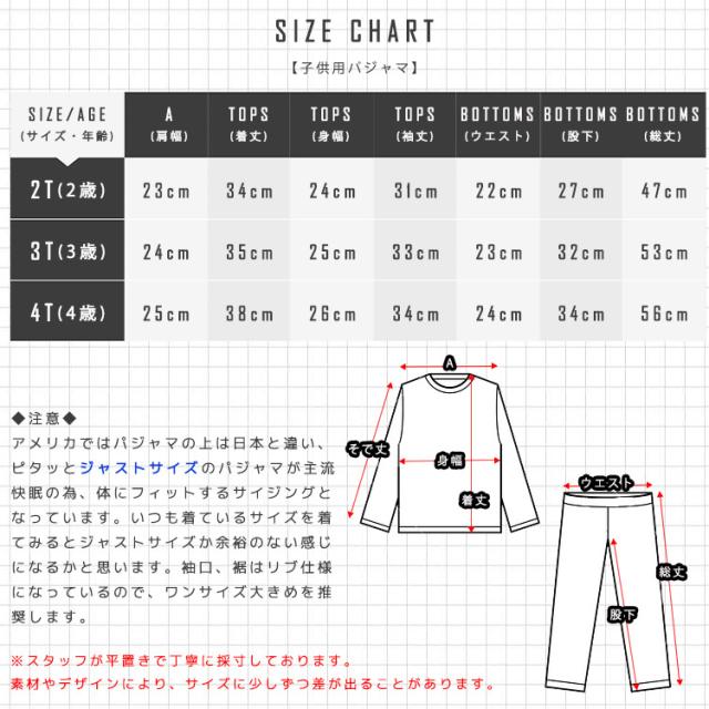 誕生日やクリスマスプレゼントにもおすすめ! 大好きなキャラクターと一緒におやすみ! ・快眠の為、体にフィットするサイジング。 ・タグレスでチクチクも解消。 ※アメリカのパジャマはピタッとジャストフィットが主流になります。 アメリカサイズが不安な方は普段の日本サイズでは少し小さく感じられると思います。 裾はリブ仕様なのでワンサイズアップを推奨します。 |