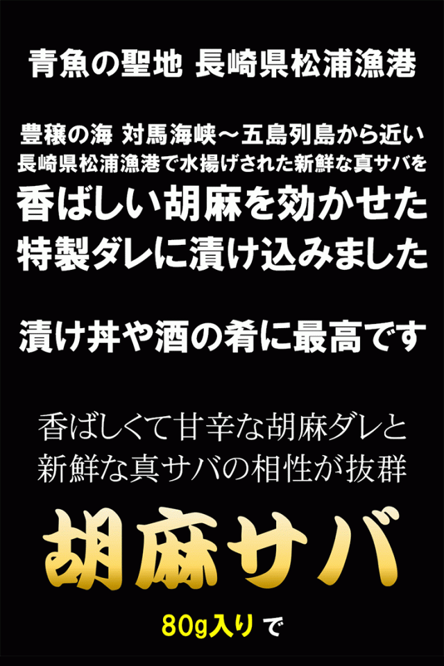 原材料名:真さば(長崎県産)、ごま、醤油、蛋白加水分解物、砂糖、味醂、食塩 / 調味料(アミノ酸等)、カラメル色素、酸味料、(一部に小麦・ごま・さば・大豆を含む)