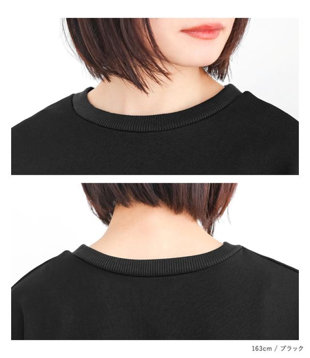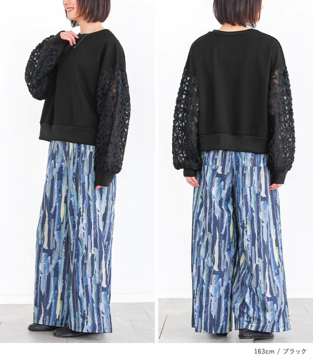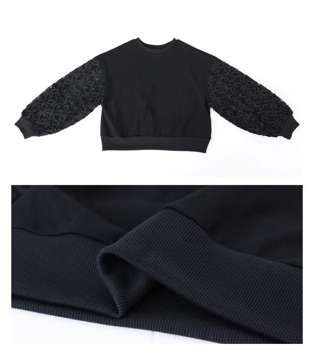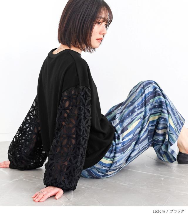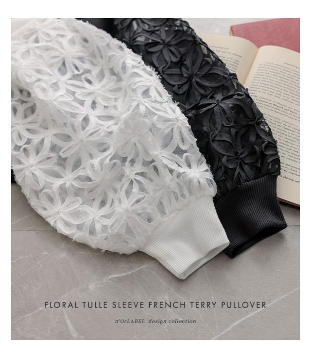 <冬新作>『袖花チュール裏毛プルオーバー』【メール便不可】【20】[プルオーバー レディース トップス 長袖 スウェット 透け感 シアー チュール 花柄 ぽわん袖 異素材 春 秋 オシャレウォーカー]