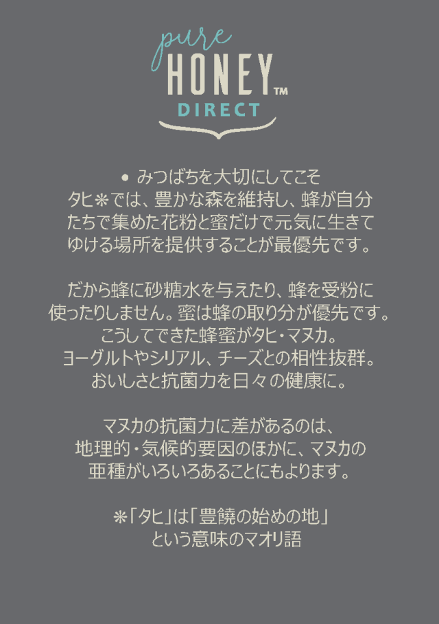 ◆だから蜂に砂糖水を与えたり、蜂を受粉に使ったりしません。蜜は蜂の取り分が優先です 。こうしてできたはちみつが苦みを感じさせない、シルクのような滑らかさ、タヒ マヌカ なのです。ヨーグルトやシリアル、チーズとの相性抜群。おいしさと抗菌力を日々の健康に お役立てください。