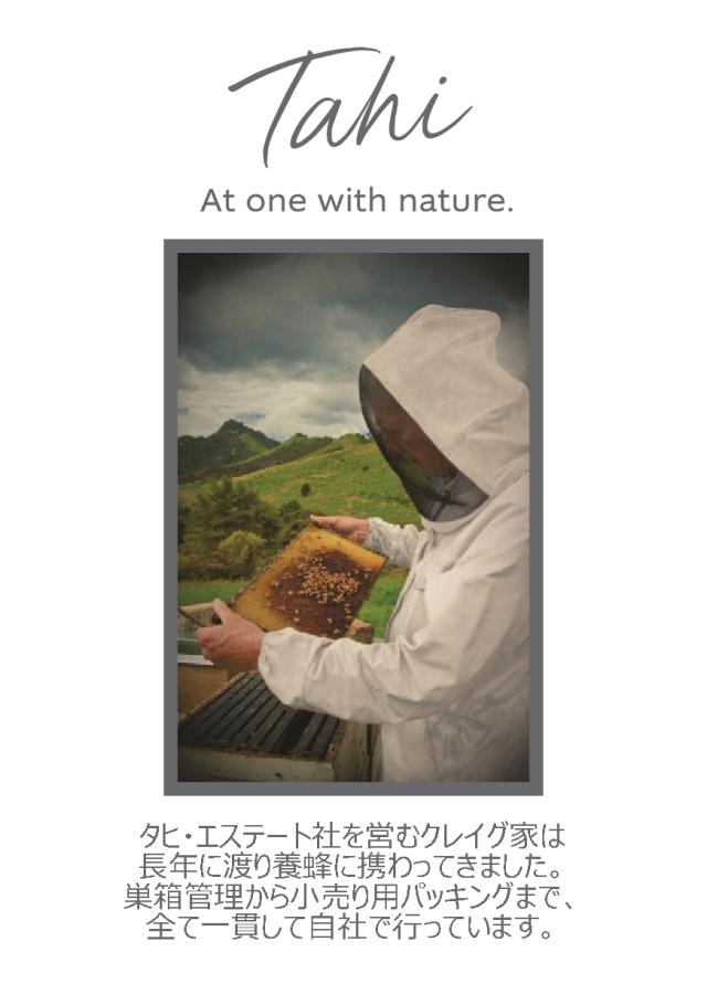◆NZ北島北部のタヒ・エステート社は、巣箱管理から小売り用パッキングまで、一貫して 自社で行うはちみつ生産会社です。タヒを営むクレイグ家は長年に渡り養蜂に携わってきま した。「タヒTahi」はマオリ語の「オフアタヒ」「豊饒の始めの地」の略です。