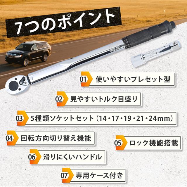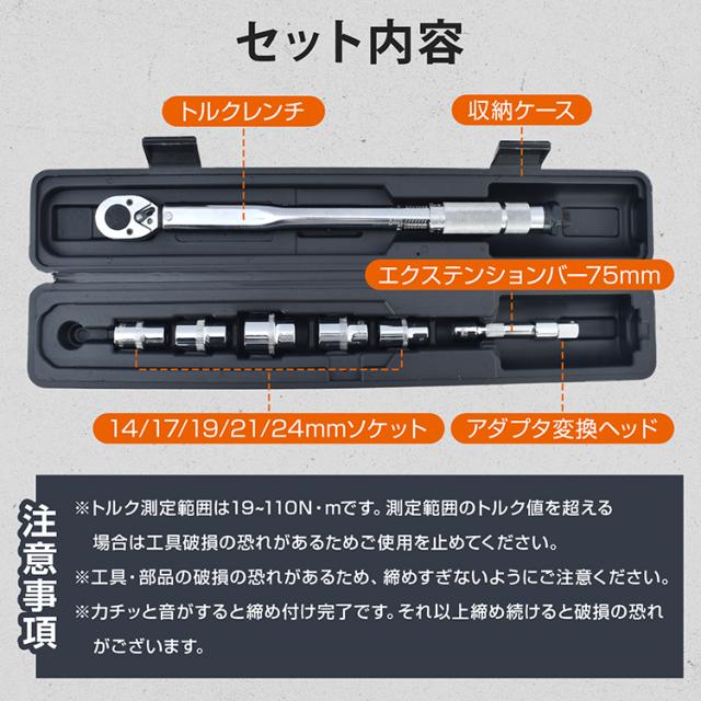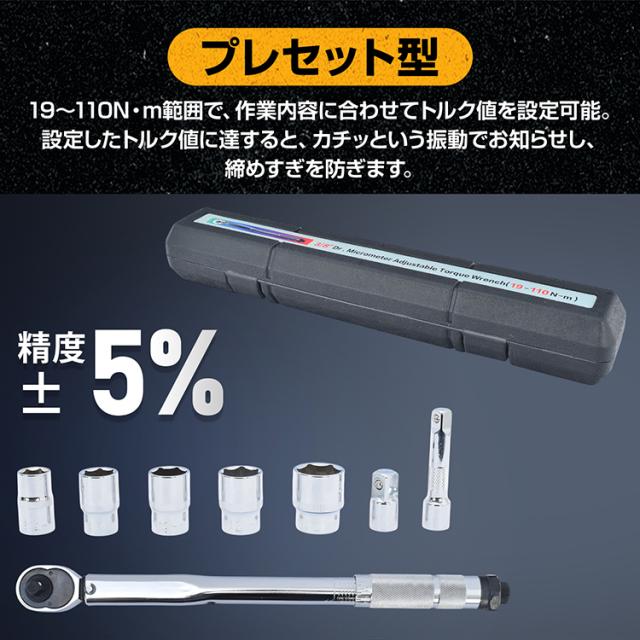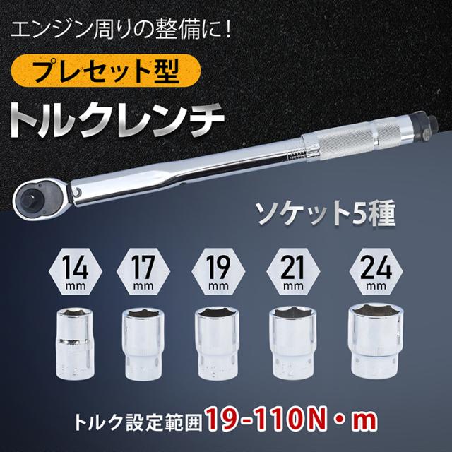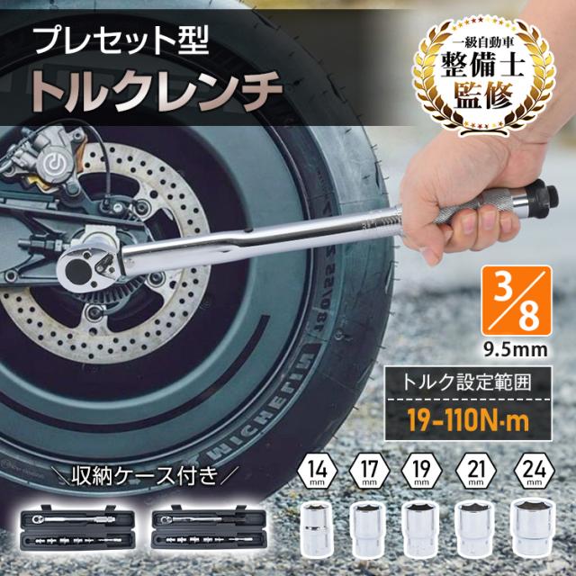 トルクレンチセット トルクレンチ プレセット型 3/8インチ 19-110N・m バイク 車 整備 工具 エンジン整備 ソケット5種 14mm 17mm 19mm 21mm 24mm 収納ケース Nm KGS ee466