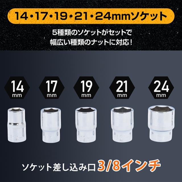 ■ 14・17・19・21・24mmのソケット5種と収納ケースが付属します。