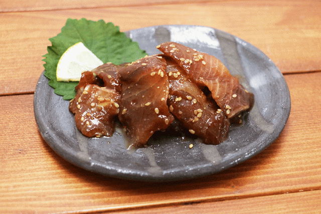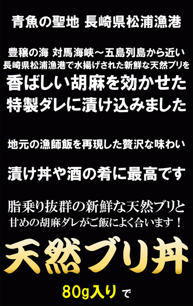 原材料名:ぶり(長崎県産)、醤油、ごま、水飴、米醗酵調味料、魚介エキス、ゼラチン、酵母エキス、(一部に小麦・ごま・さば・大豆・ゼラチンを含む)