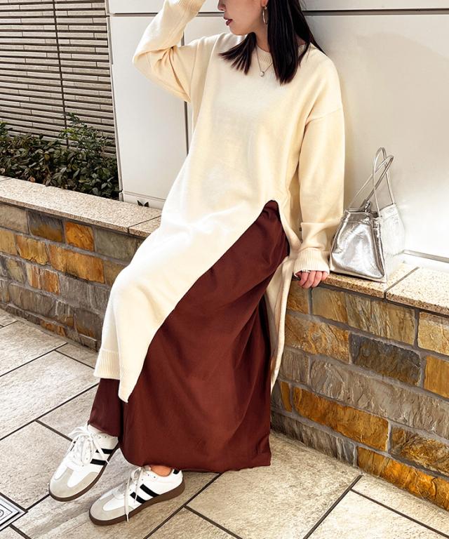 新作 ディープスリットワイドストレートレイヤードニットワンピース レディース 春 秋 冬 長袖 ロング丈 ゆったり 防寒 暖かい あったか おしゃれ きれいめ 可愛い カジュアル 膝下 ひざ下 重ね着 寒さ対策
