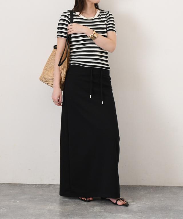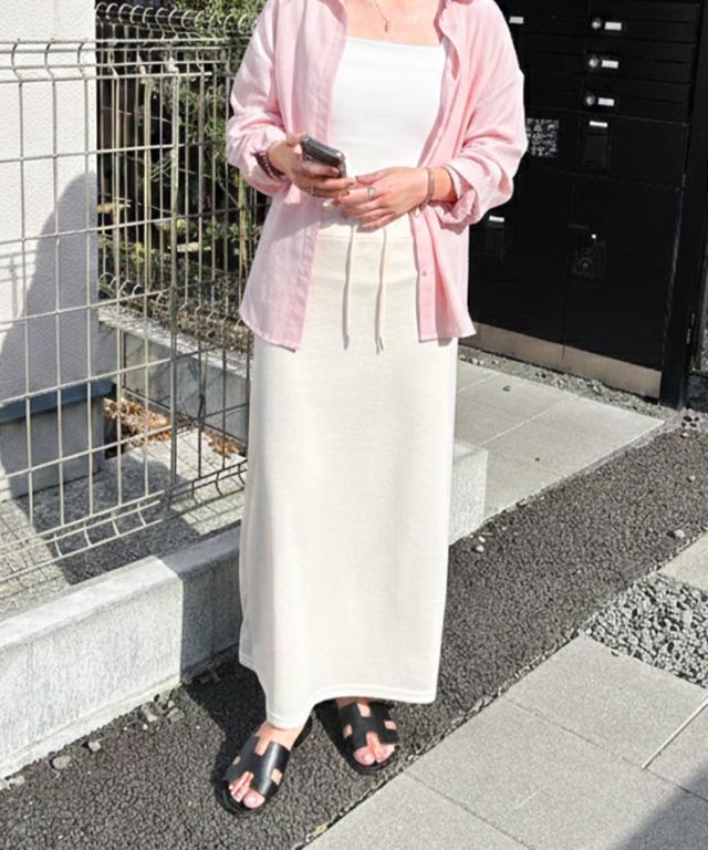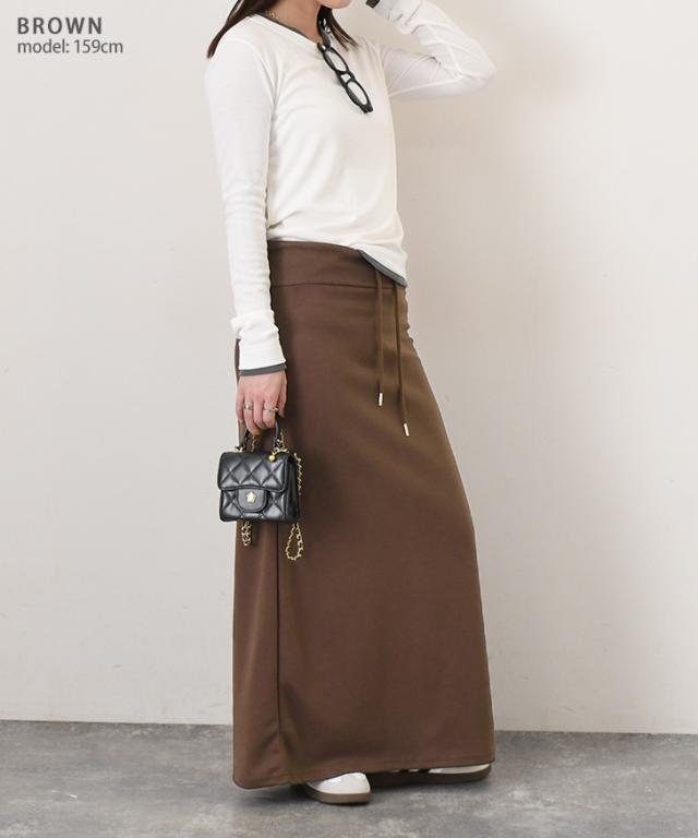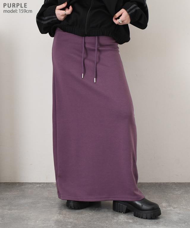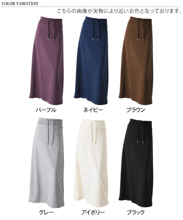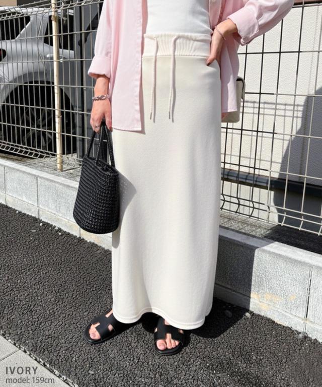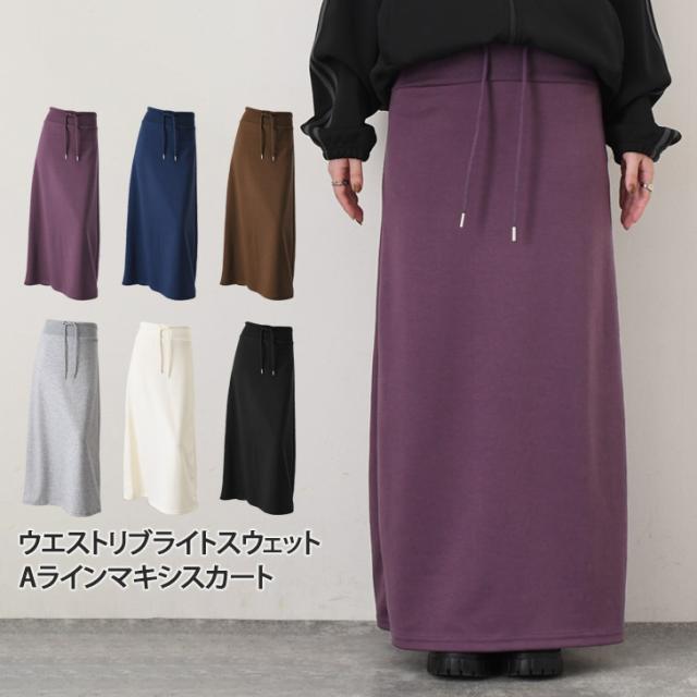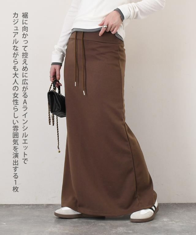 新作 ウエストリブドローストリングライトスウェットAラインマキシスカート レディース 膝下 ロング丈 マキシ丈 春 秋 ボトムス ウエストゴム ストレッチ 軽い ナロースカート オフィス カジュアル 韓国ファッション
