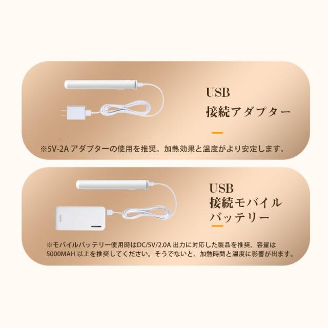 USB ケーブル式の給電設計で、家の充電器はもちろん、モバイルバッテリーや車載 USB からも電源を取れ、外出先や出張先でも場所を選ばず使用可能。