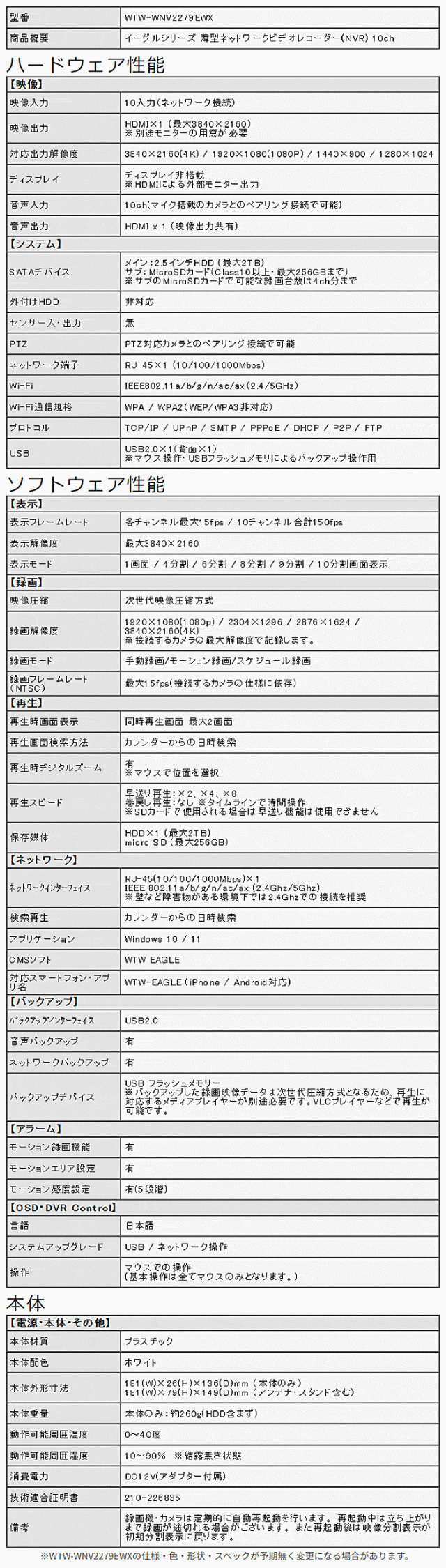 ■ WTW-WNV2279EWX | EAGLEシリーズ専用 10chネットワークビデオレコーダー