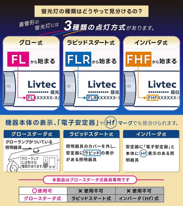※蛍光灯の種類を間違えてしまうと点灯しない、すぐに壊れるなどのトラブルが発生します。