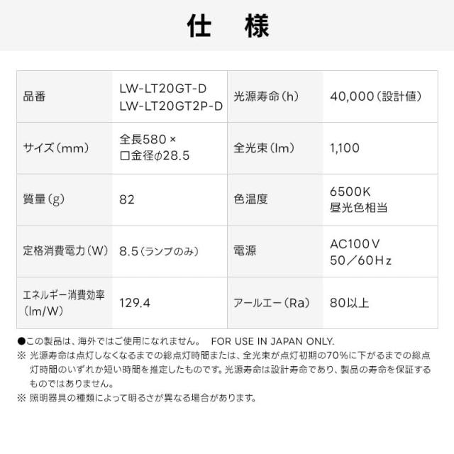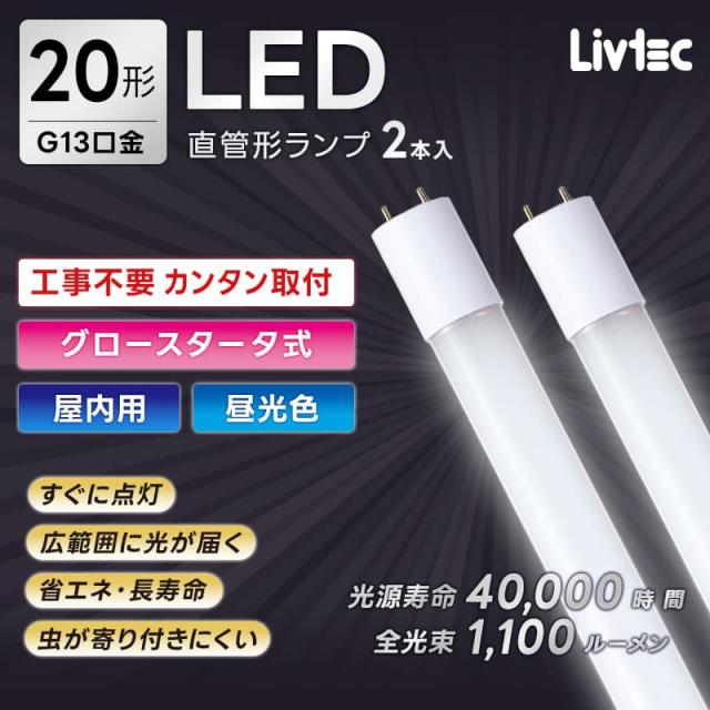 ユアサプライムス Livtec LED蛍光灯 20W形 2本入り 直管 グロー式 工事不要 LED直管 昼光色 6500K 8.5W 1100lm LW-LT20GT2P-D YUASA PRIMUS リブテック