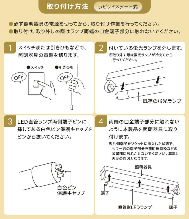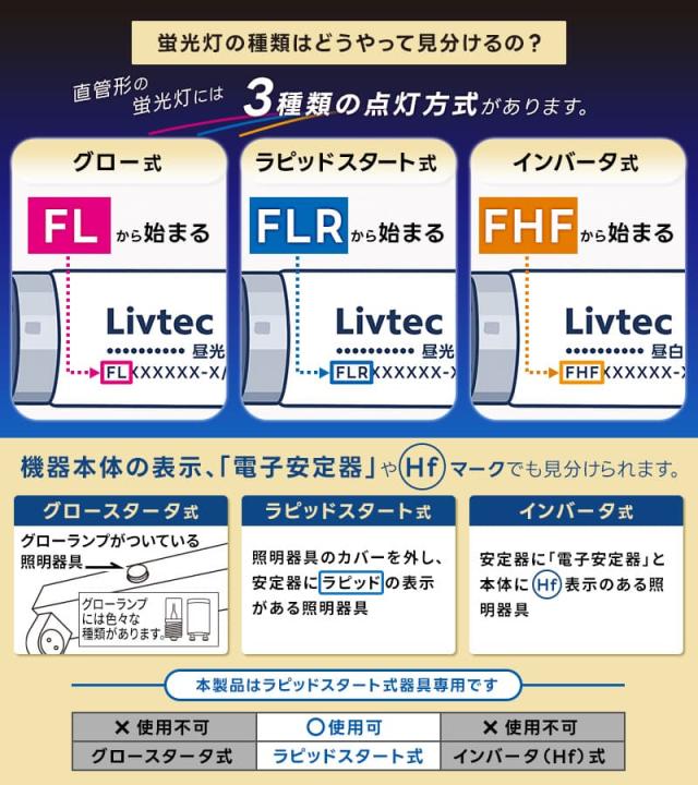 ※蛍光灯の種類を間違えてしまうと点灯しない、すぐに壊れるなどのトラブルが発生します。