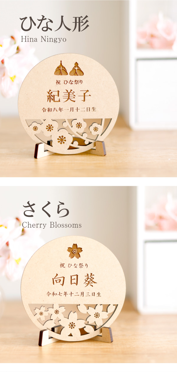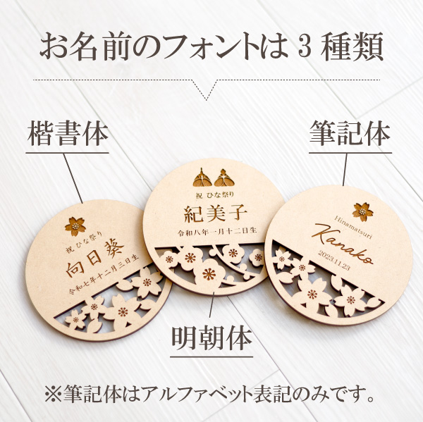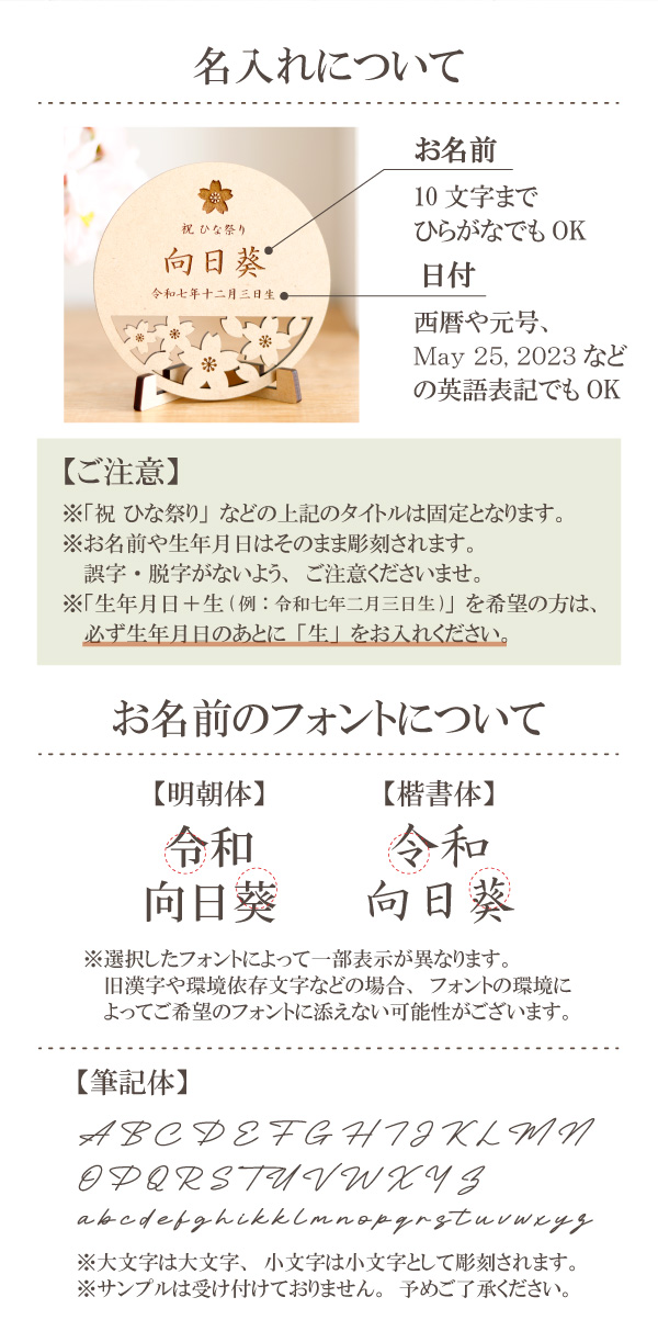 | 備考 | 当店では在庫を複数サイトで共有している為、同時にご注文があった場合売り切れとなる可能性がございます。 【商品ついて】 ■モニターによって実物と多少色が異なる場合がございます。 ■表記のサイズは実際の計測値です。参考サイズとしてご覧ください。 ■表面に黒い点々や糸くずのようなものがありますが、木材チップによるものです。汚れではございません。 ■天然の木材を使用しているため、色合いや明るさが異なる場合がございます。 ■レーザー加工機で作成しているため、稀に焦げや傷が付着する場合がございます。製作の工程上避けられませんので、予めご了承ください。 ■断面に触れると焦げが付着する恐れがあります。取り扱いにはご注意ください。 ■上記の理由で返品・交換はお受けできかねます。予めご了承ください。 【名入れについて】 ■お名前は10文字まででお願いいたします。 ■お名前のフォントは「楷書体」・「明朝体」・「筆記体」の3種類です。 ■選択したフォントによって一部表示が異なります。 旧漢字や環境依存文字などの場合、フォントの環境によってご希望のフォントに添えない可能性がございます。 ■筆記体はアルファベットのみ対応です。大文字は大文字、小文字は小文字として彫刻されます。 ■文字数により文字の大きさや文字間が画像のイメージと異なることがあります。 ■お名前や生年月日はそのまま彫刻されます。誤字脱字による返品・交換はお受けできかねます。 ■「生年月日+生(例:令和七年二月三日生)」を希望の方は、必ず生年月日のあとに「生」をお入れください。 ■「祝 ひな祭り」などの上記のタイトルは固定となります。 ■サンプルは受け付けておりません。予めご了承ください。 |