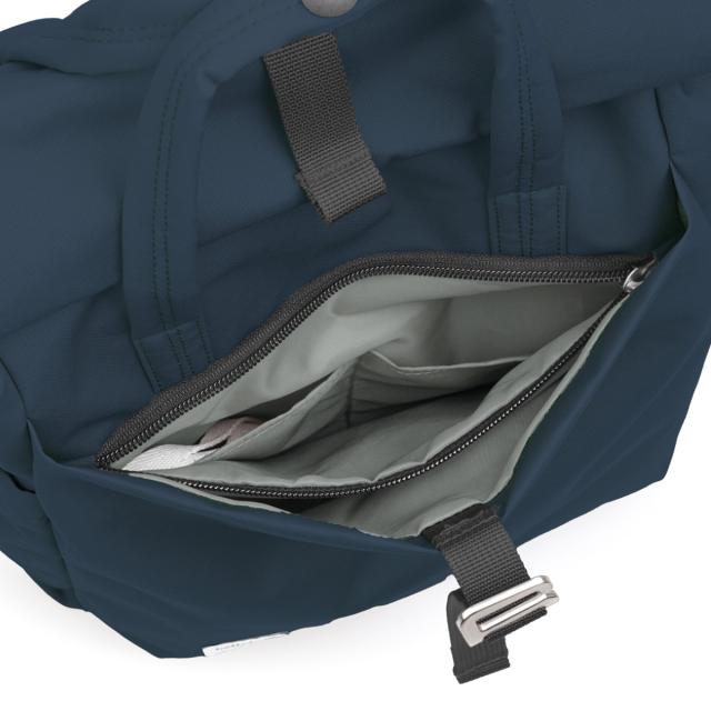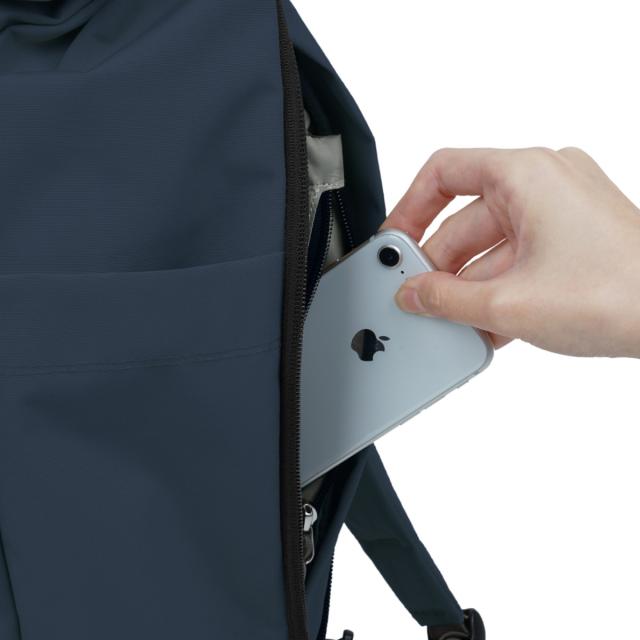 メイン収納にアクセスできる背面ファスナーの他、大事な物を入れておけるファスナーポケットも付いています。