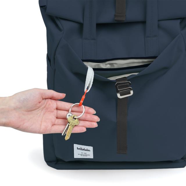 前面のキークリップ付きファスナーポケットは、すぐに取り出したい物を入れておくと便利です。