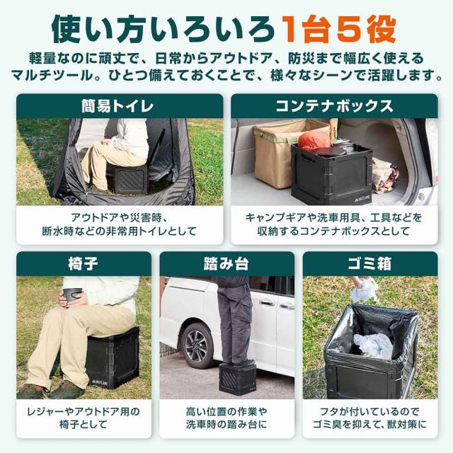 トイレとしてだけでなく、コンテナボックス・ゴミ箱・椅子・踏み台としても使える多用途設計。