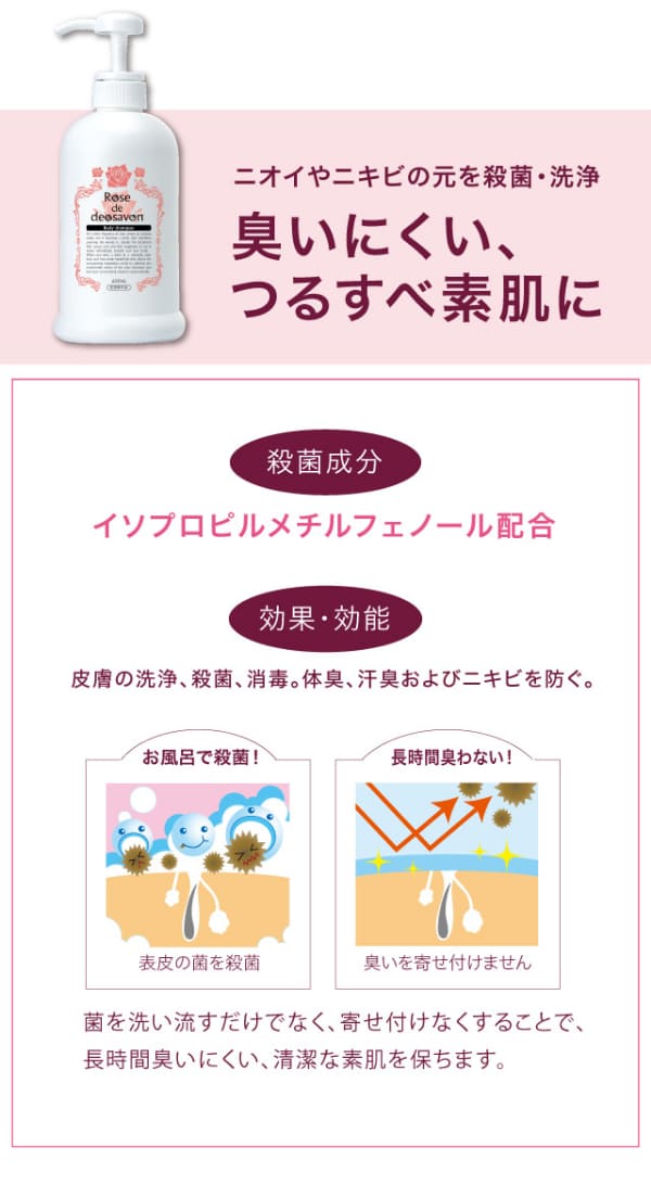 医薬部外品!気になる体臭・汗のニオイ・ニキビを防ぐ、有効成分「イソプロピルメチルフェノール」配合の薬用デオドラントボディソープ。ニオイやニキビの原因菌をすっきり洗浄し、長時間嫌なニオイをカットします。脇やワキガ、デリケートゾーンのケアにも使用できます。泡立ちが良く、洗い心地もスッキリ。さわやかなバラの香りに癒されます。600mlの大容量で、家族での使用やリピーターに適しています。