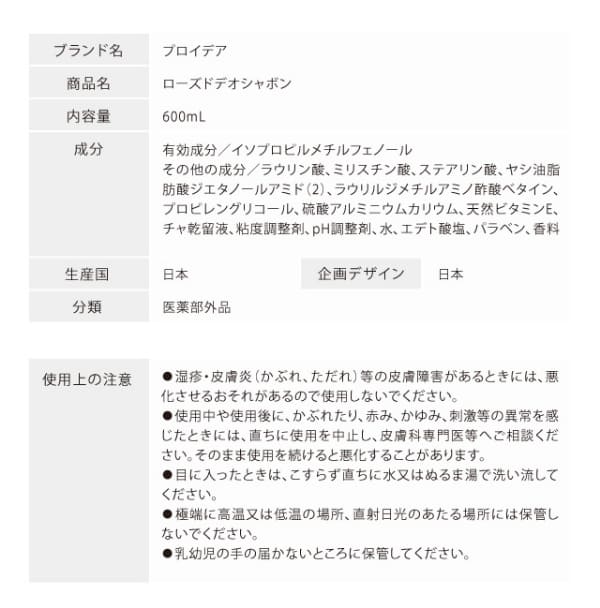 【販売名】薬用ボディーソープDM【内容量】600ml【成分】■有効成分:イソプロピルメチルフェノール、■その他の成分:ラウリン酸、ミリスチン酸、ステアリン酸、ヤシ油脂肪酸ジエタノールアミド(2)、ラウリルジメチルアミノ酢酸ベタイン、プロピレングリコール、硫酸アルミニウムカリウム、天然ビタミンE、チャ乾留液、粘度調整剤、pH調整剤、水、エデト酸塩、パラベン、香料【区分】日本製・医薬部外品【ブランド】プロイデア(PROIDEA)【メーカー】株式会社ドリーム
