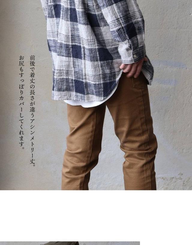 ・前後で着丈の長さが違うアシンメトリー丈。お尻もすっぽりカバーしてくれます。