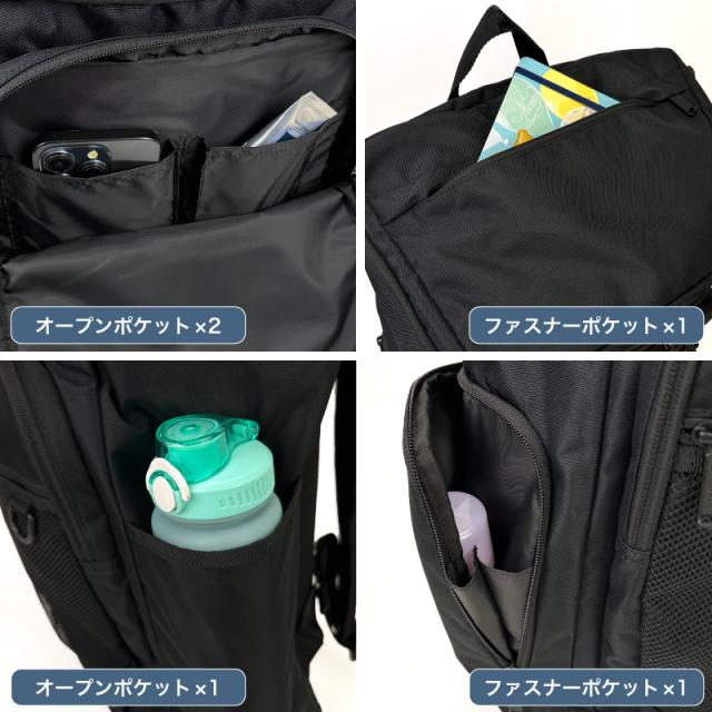 | ポケット | (外側)ファスナーポケット×3(そのうち一つは、オープンポケット×2)、メッシュファスナーポケット×1、オープンポケット×1 (内側)クッションポケット×1 |