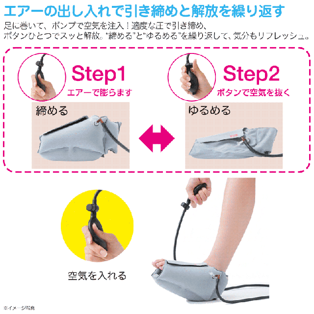 ポンプで空気を注入することで足をしっかり引き締め、ボタンひとつで簡単に解放。