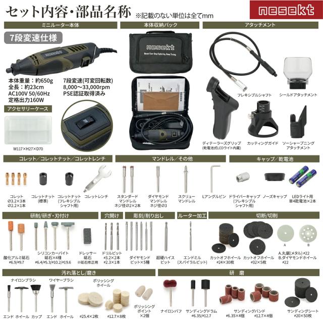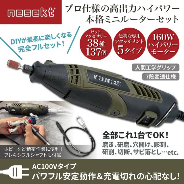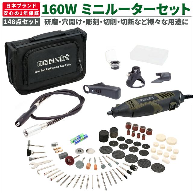 [ネセクト] ミニルーターセット 148点 7段速度調整 高出力160Wモーター AC100V仕様 フレキシブルシャフト ビット付属 彫刻 穴あけ 研磨 切断 切削 汚れ落とし[日本国内企画品 1年保証]