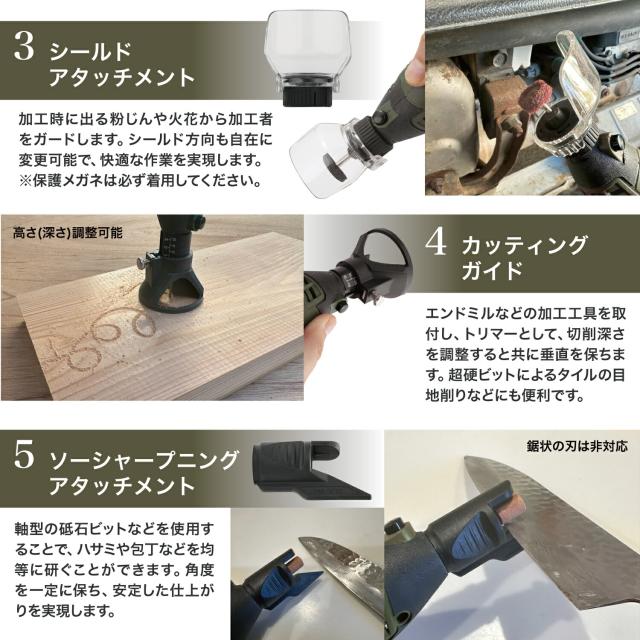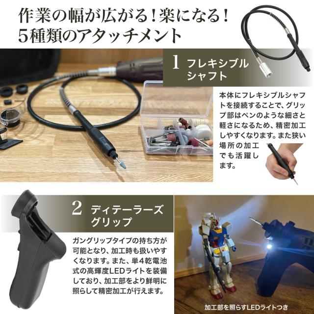【便利なアタッチメントも豊富にセット】一般的には別売となるフレキシブルシャフトを標準でセットしています。フレキシブルシャフトを装着すればモーターのある本体部分と分離されるため、小型軽量なペングリップ部の保持のみで作業が可能となります。極めて繊細な作業もペンで描くような軽い操作感で行えます。またガンタイプの形状を採用したディテーラーズグリップは作業性を向上させる操作感を得られるだけでなく、LEDライトユニット(単4電池式/テスト電池2本付属)を内蔵しており、暗所での作業や加工物を明るく照らした状態での作業にも配慮しています。シールドアタッチメントは切り子や切断片などの飛散を防止するもので、金属切断やワイヤーブラシでの研磨の際に作業者を保護します。カッティングガイドは刃物を砥石ビットを用いて研ぐ際にサポートするもので、平行のガイドと30°の角度を持つガイドにより刃物の研ぎ作業を高速かつ高精度に行うことが出来ます。