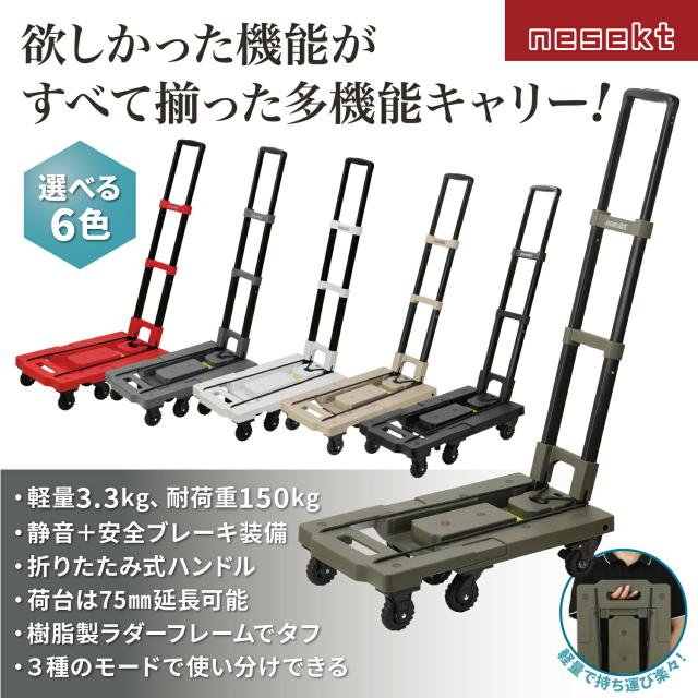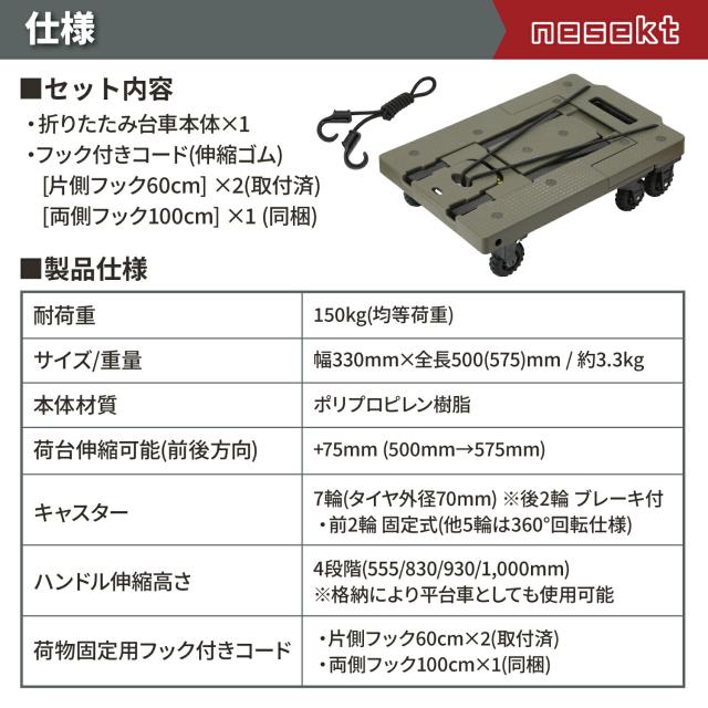[ネセクト] 折りたたみ式台車 耐荷重150kg 軽量コンパクト 高さ調整可能 7輪大径静音キャスター 伸縮荷台 固定用ゴムロープ付属 防災用台車 アウトドア 屋外対応 平台車 [日本国内企画品 1年保証]