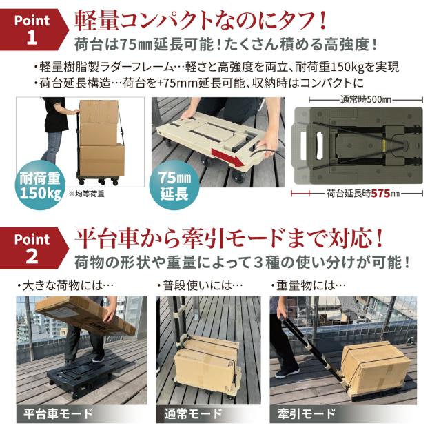 車載や家庭用に便利な軽量コンパクトな伸縮可能折りたたみ式台車!耐荷重150キロで平台車としても使用可