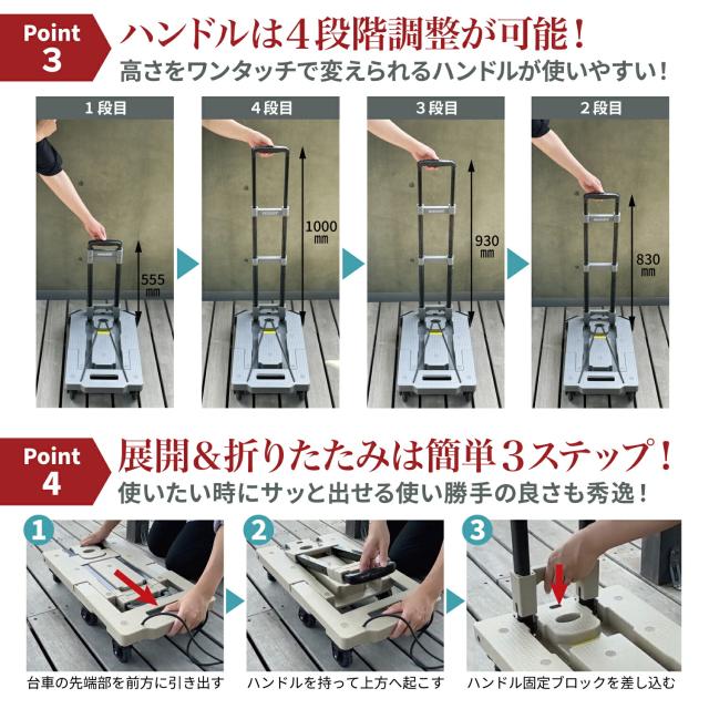 ハンドル部を折り畳めば天板がフラットになり平台車としても使用可能!大型の家具などを運ぶ際に便利です。 使用しない時は部屋の隙間やクローゼット、ベッドの下、車のトランクなどに簡単に収納できます。