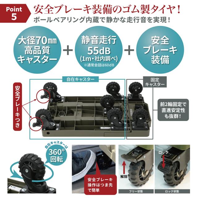 ボールベアリング内蔵でスムースなキャスター(車輪)はこだわりの大型のゴムタイヤを採用し、優れた静音性と走破性を両立しました。段差の多い屋外でも安心してご使用いただけます。 360°回転する自在キャスターと直進性を確保する固定キャスターを最適に配置し、小回り性と直進安定性も両立させています。